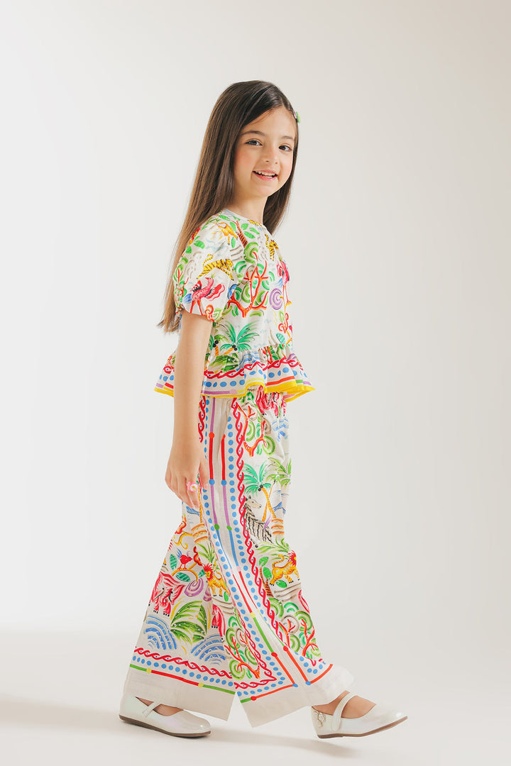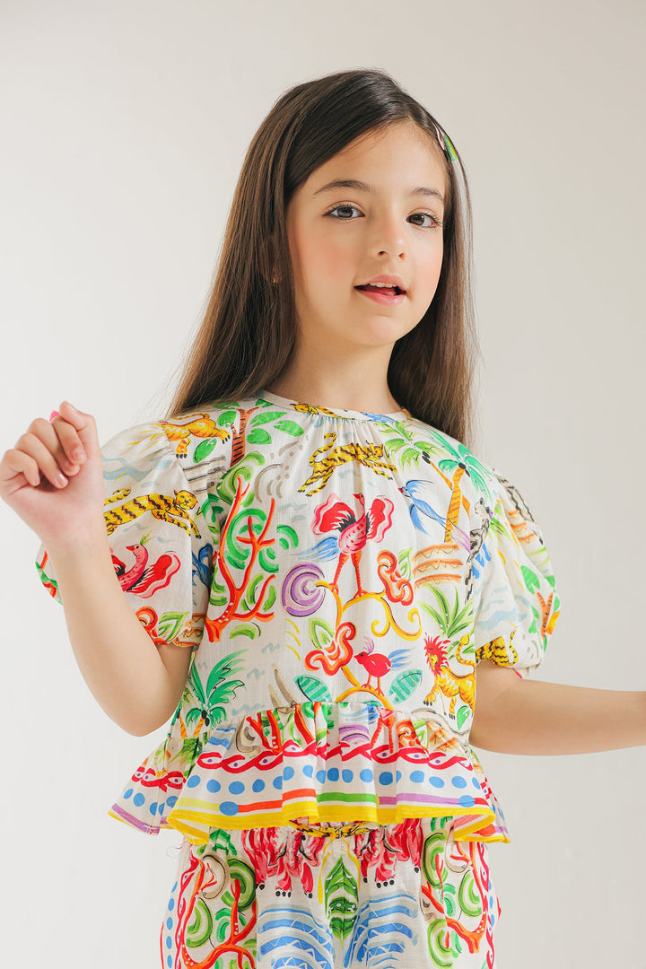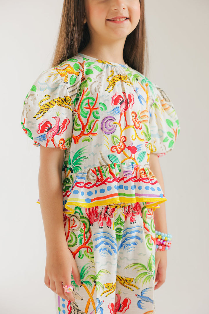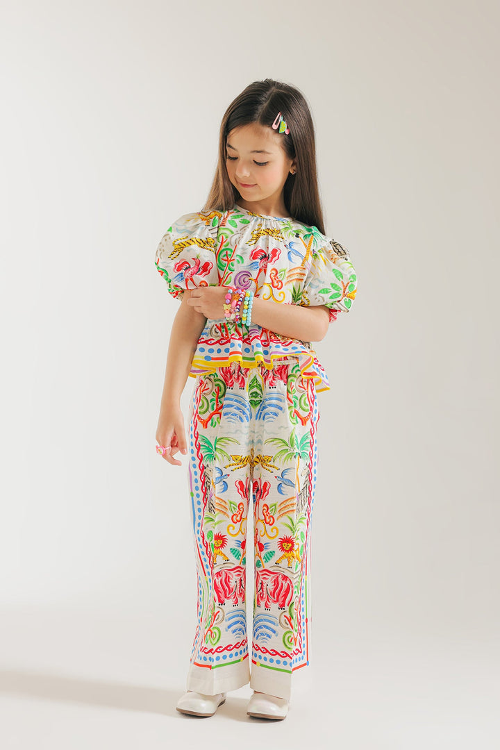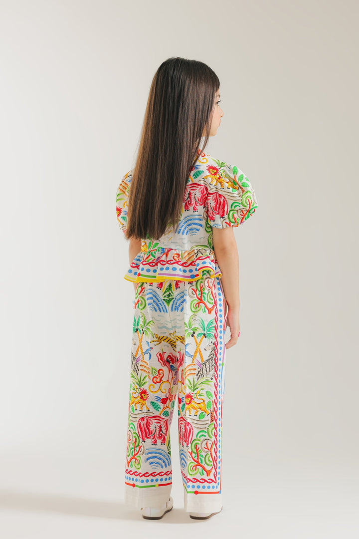 This trendy co-ord set features a unique design of animal illustrations printed on a shirt with puffy short sleeves. The wide leg trousers provide a comfortable fit. Perfect for adding a touch of nature to your kids wardrobe.