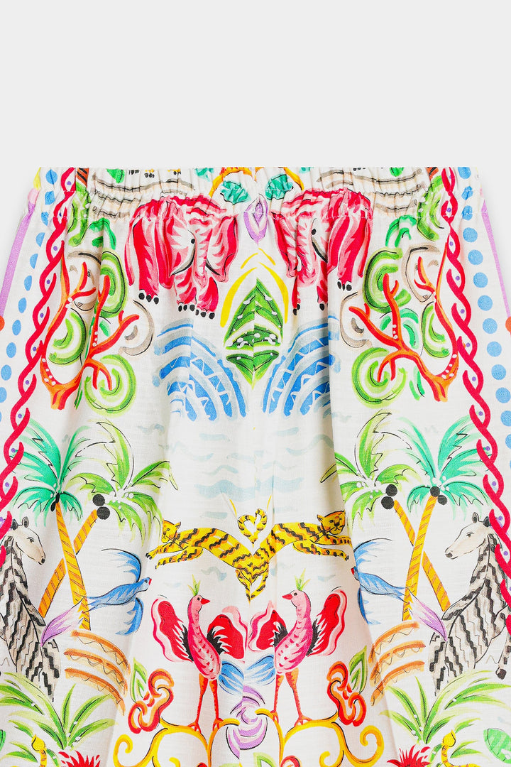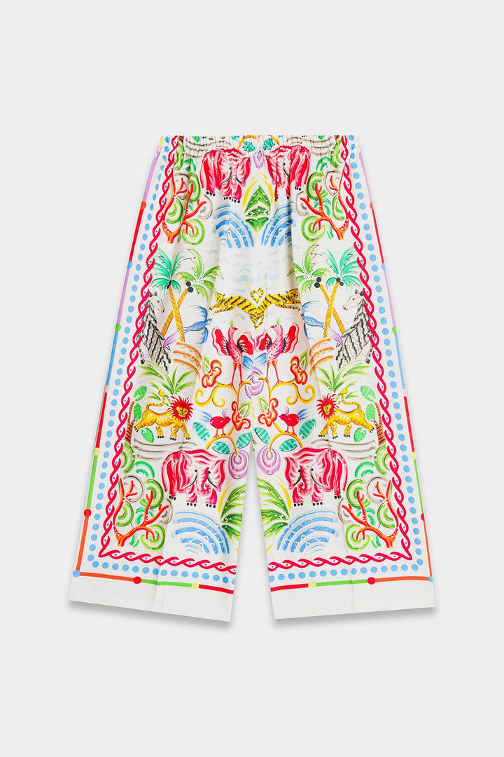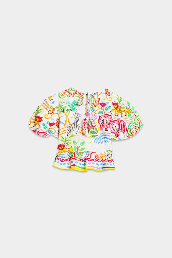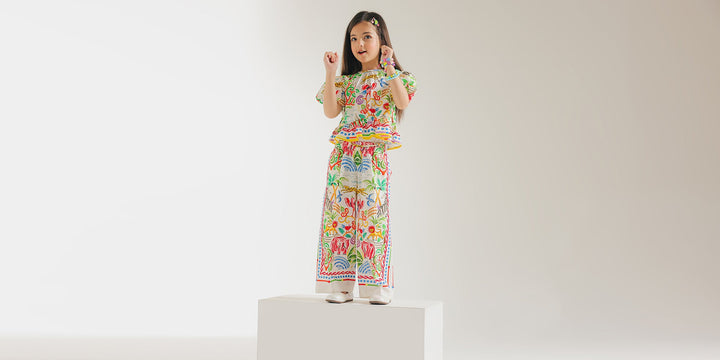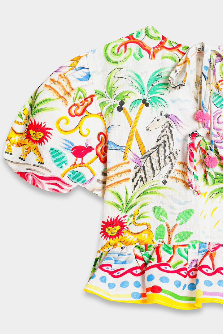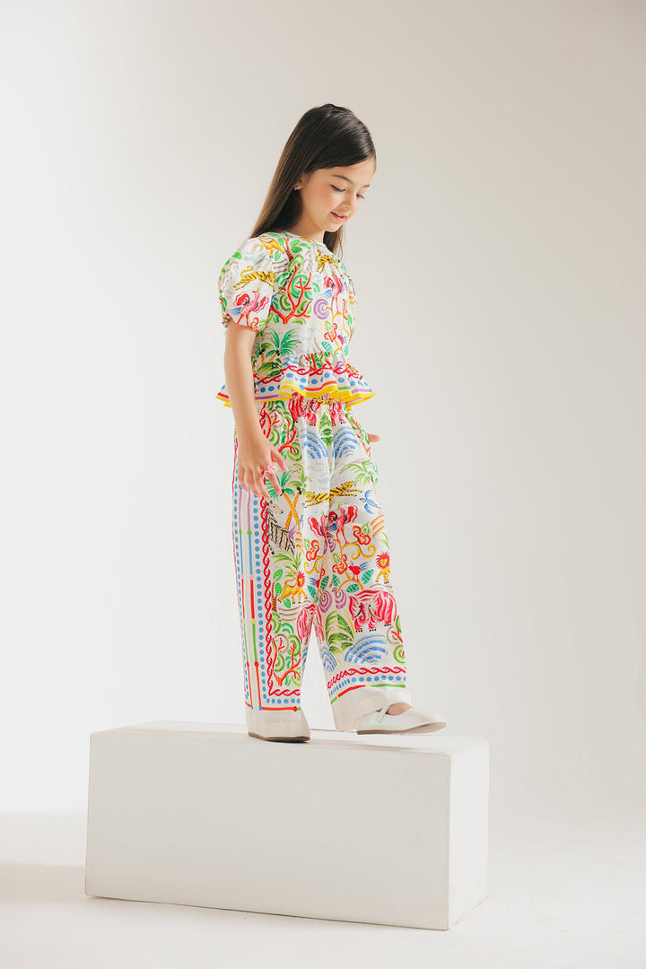 This trendy co-ord set features a unique design of animal illustrations printed on a shirt with puffy short sleeves. The wide leg trousers provide a comfortable fit. Perfect for adding a touch of nature to your kids wardrobe.