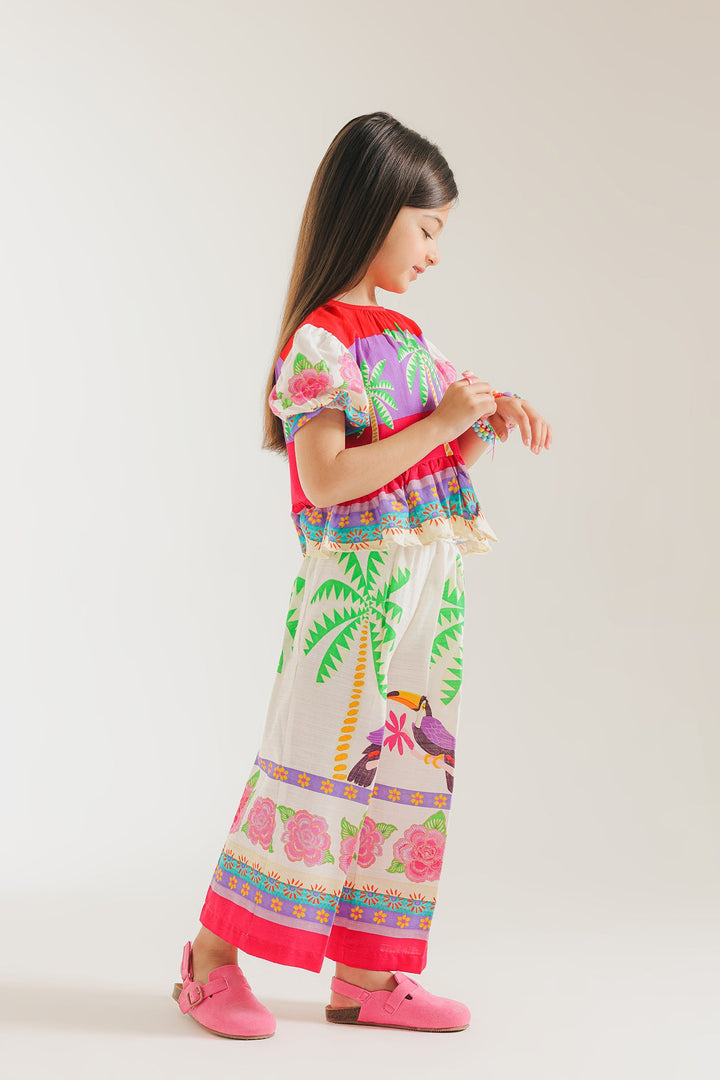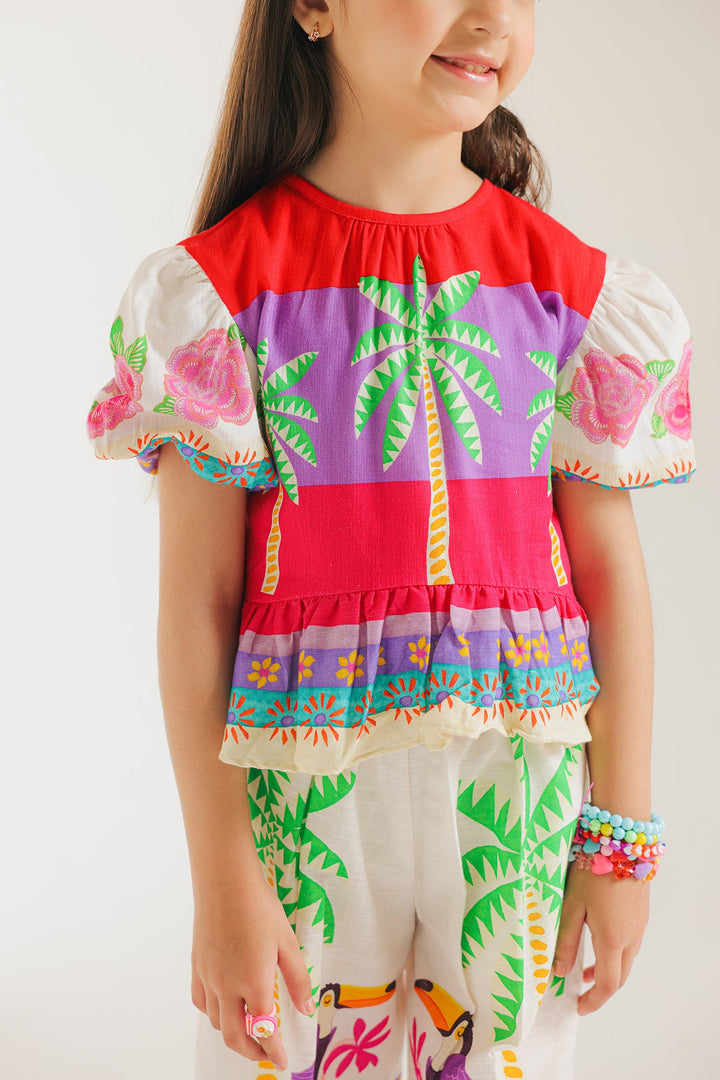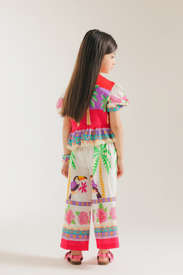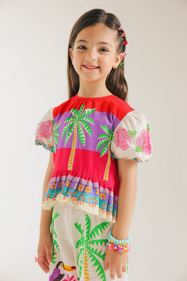 This trendy co-ord set features a unique design of birds and palm trees printed on a shirt with puffy short sleeves. The wide leg trousers provide a comfortable fit. Perfect for adding a touch of nature to your kids wardrobe.