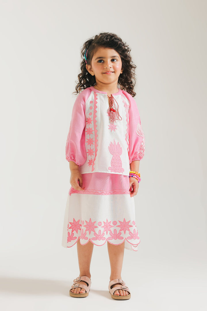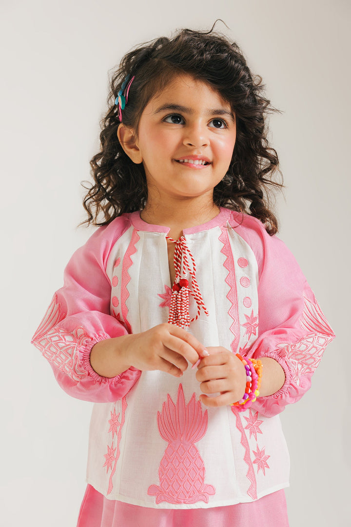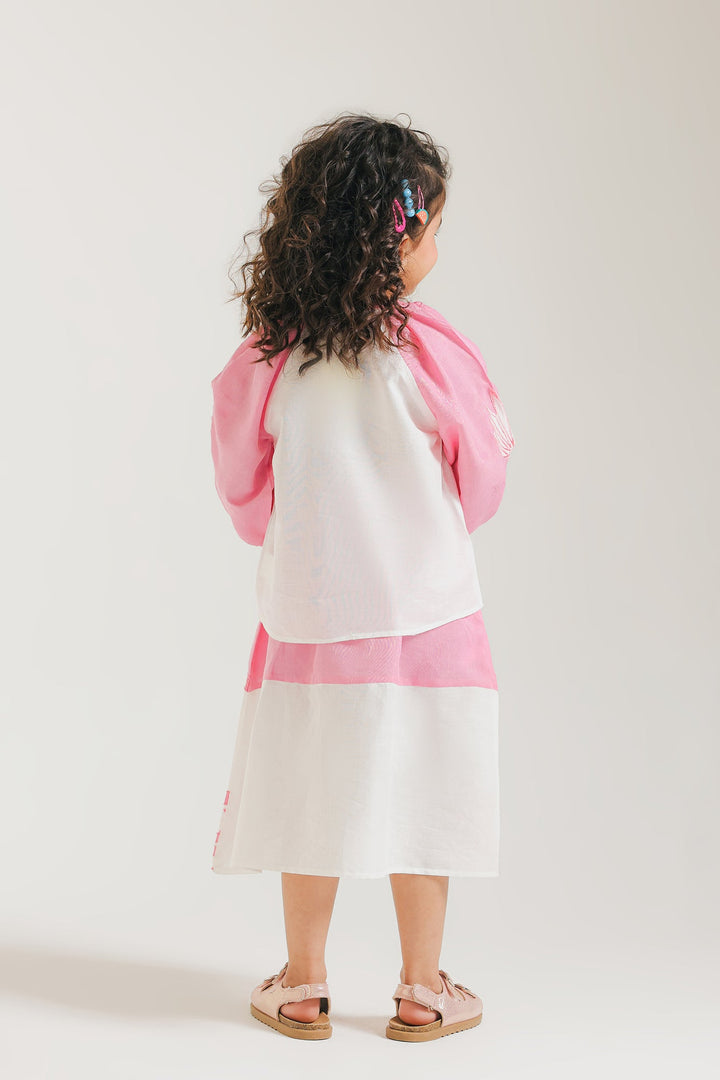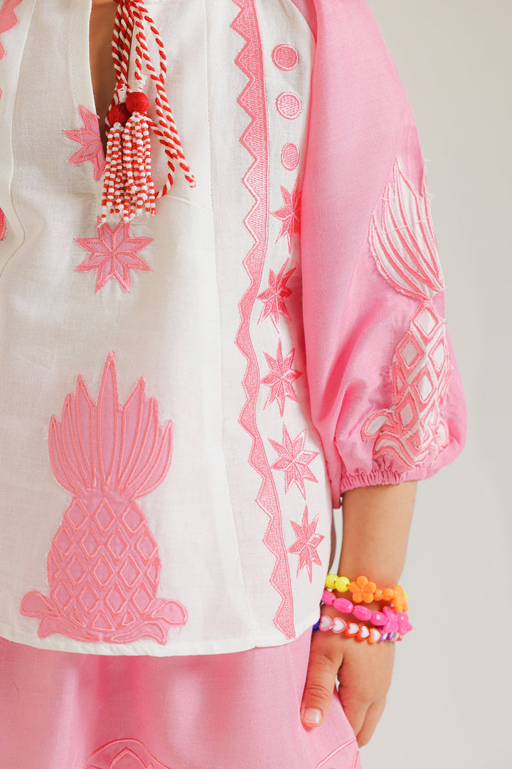 Step into a fairytale with this enchanting two-piece set. The delicate interplay of soft pink and crisp white creates a vision of pure sweetness. The top features intricate embroidery, inspired by traditional motifs, cascading down the front and adorning the balloon sleeves. Playful tassels at the neckline add a touch of bohemian flair. Matching skirt echoes the top's delicate charm with a beautifully embroidered hem, creating a cohesive and utterly delightful look.