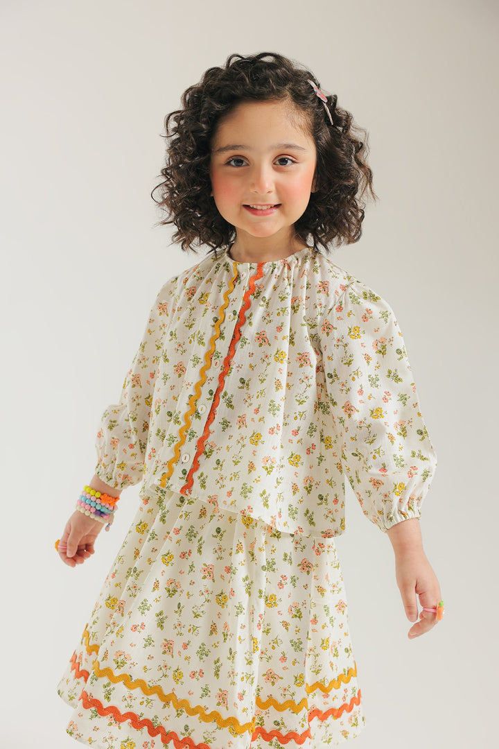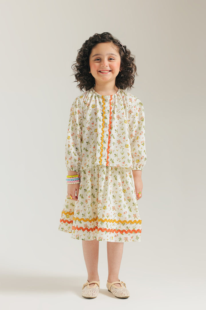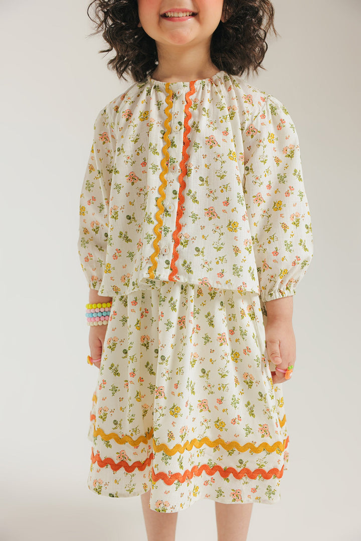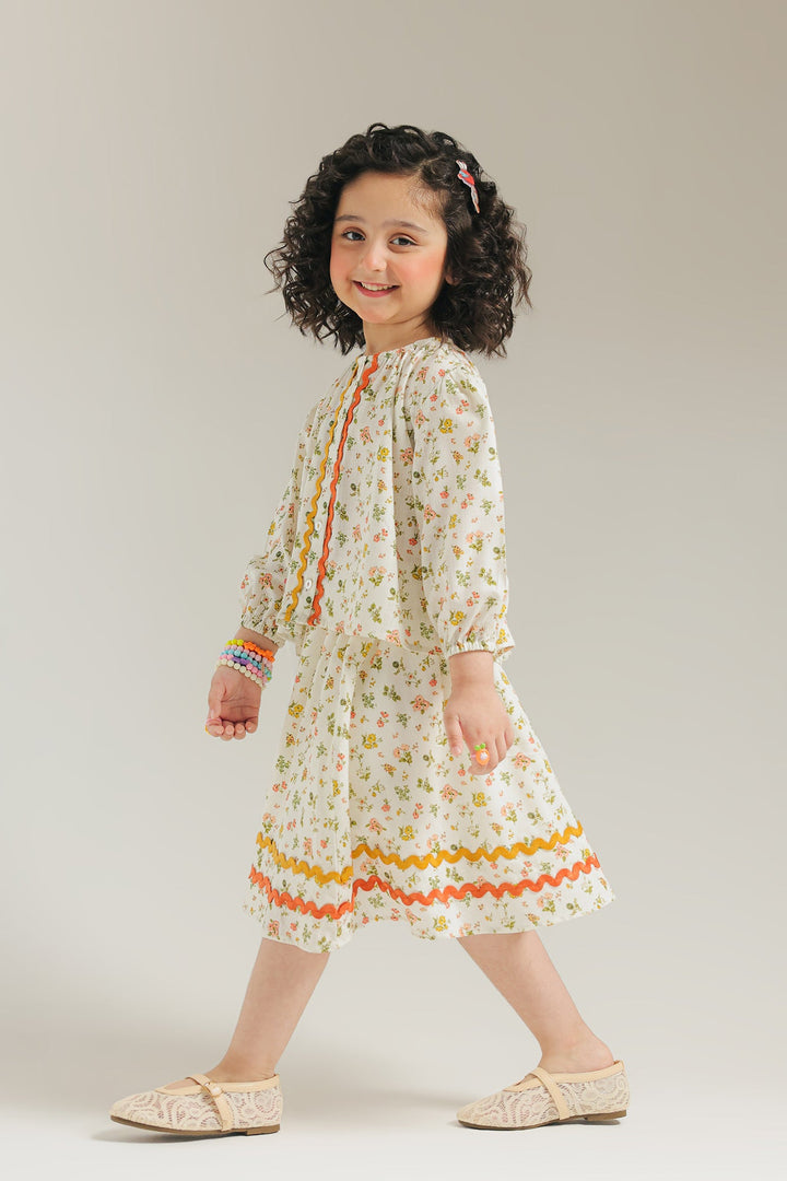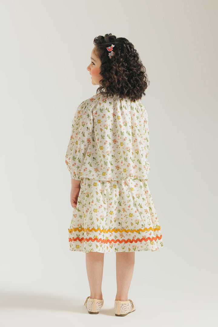 Wrap your little one in sunshine and style with this charming co-ord set. The lightweight, off-white fabric is adorned with a delicate, all-over floral print in soft yellows and greens. The top features a gathered neckline and a playful, ruffled trim in vibrant orange and yellow, adding a pop of color. The matching skirt is detailed with a similar scalloped trim, creating a cohesive and delightful look. This set is perfect for a day of play or a special outing, offering a blend of comfort and whimsical charm.