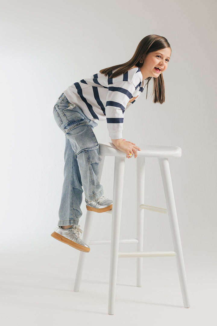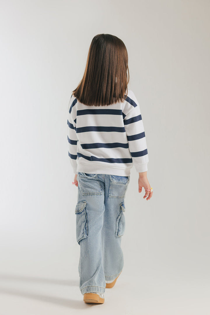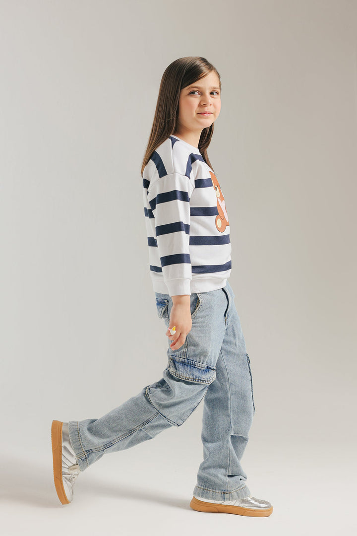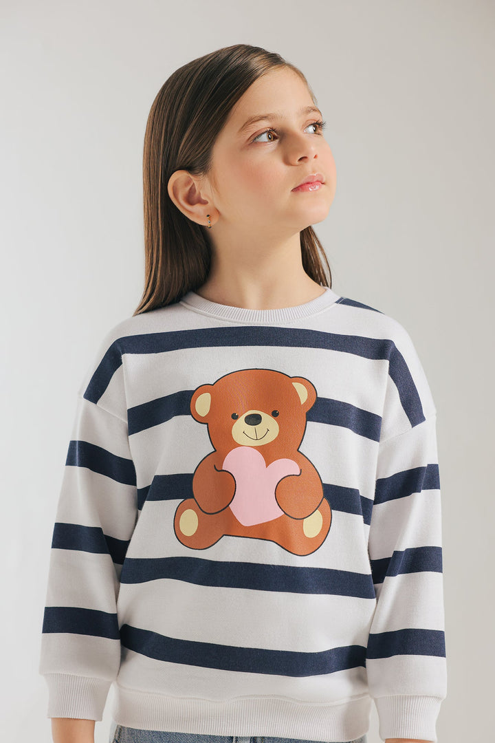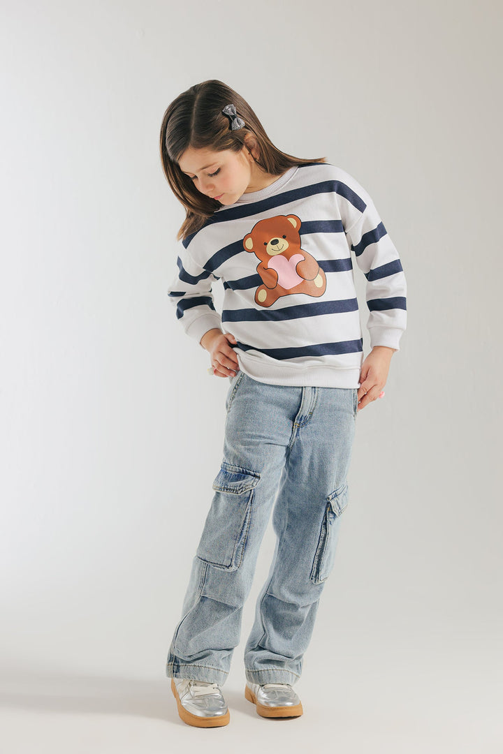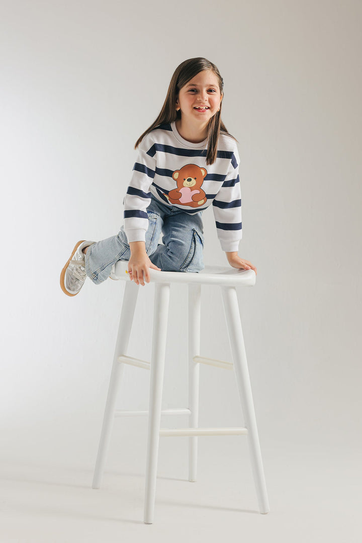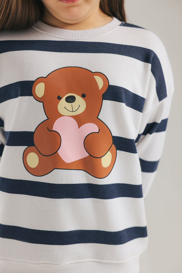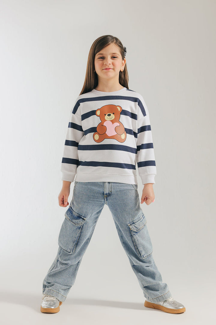 A classy yet elegant design is layered on this contemporary sweatshirt illustrating a subtle white canvas with navy blue stripes. It features a comfy silhouette and adorned with adorable teddy bear illustrations printed at front. Let your girls style this statement sweatshirt this winter season.