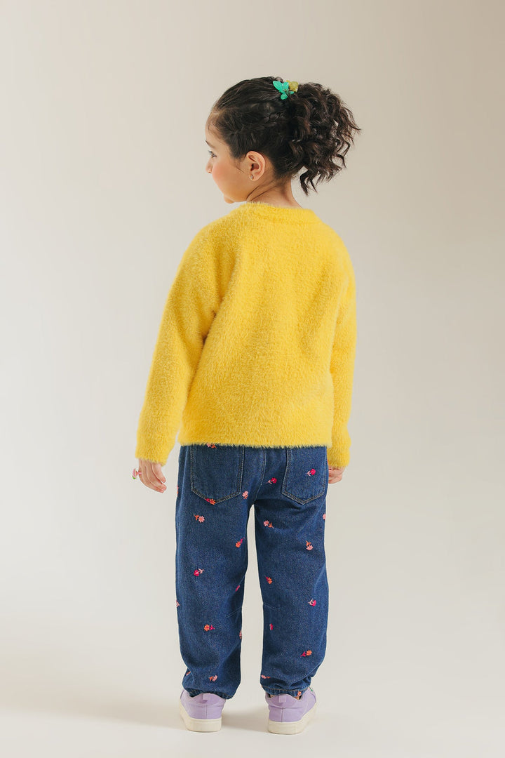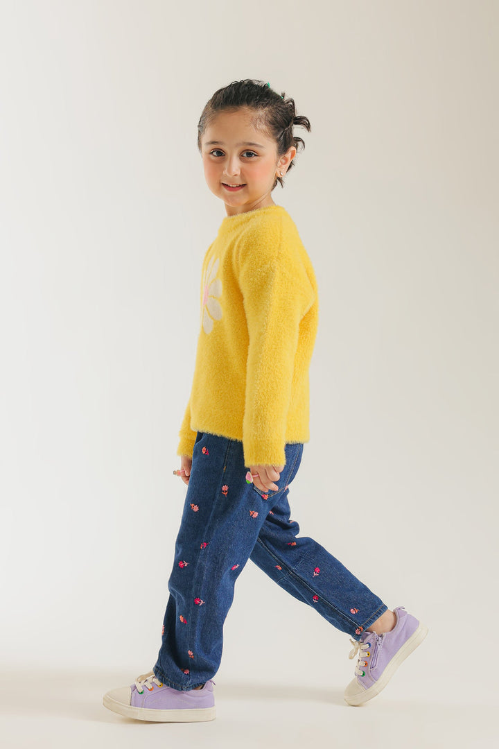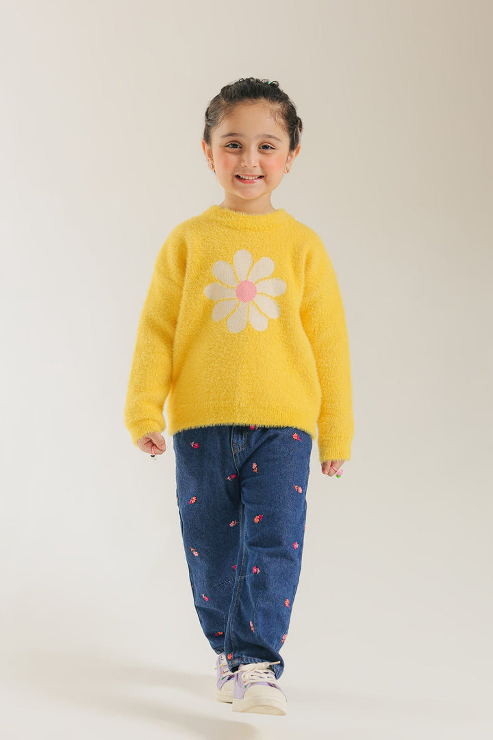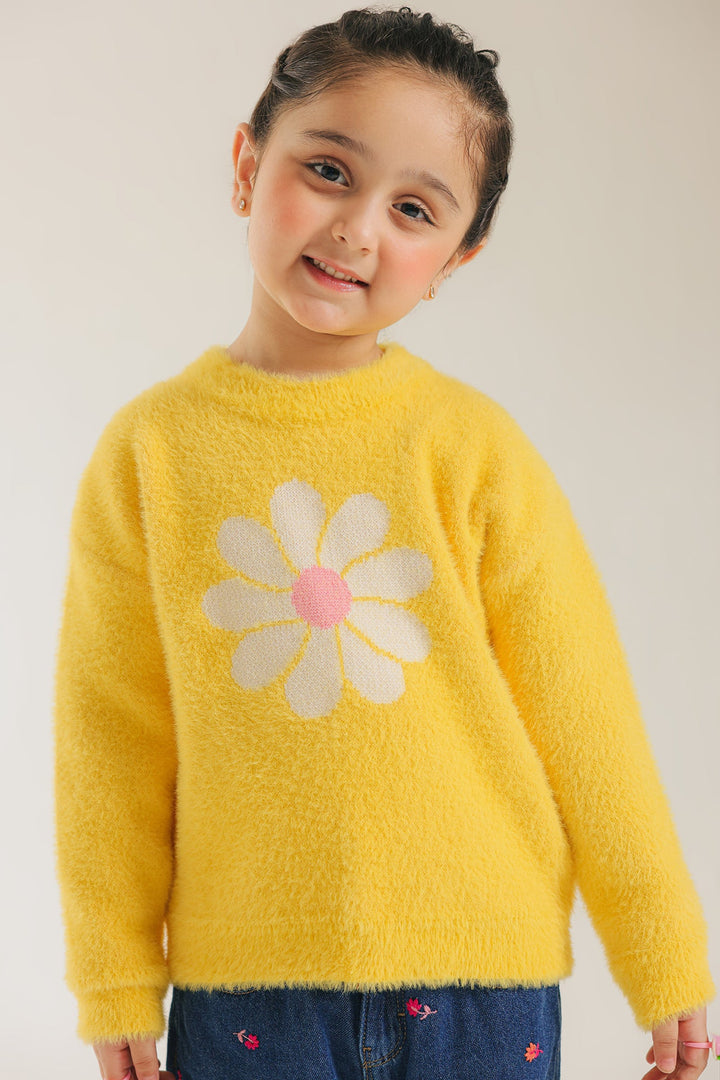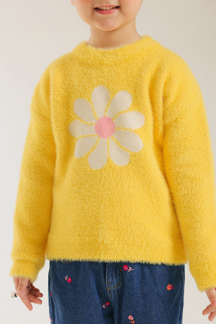 Add a cheerful burst of color to her winter wardrobe with this fun, fluffy sweater. The bright, soft yellow knit features a charming, oversized daisy flower graphic knitted directly into the front in white and light pink. This cozy sweater has a relaxed fit and long sleeves, making it the perfect playful and warm piece for everyday style.