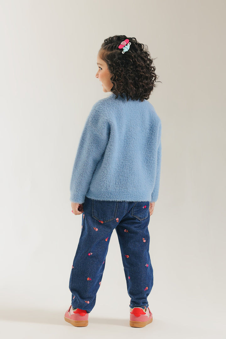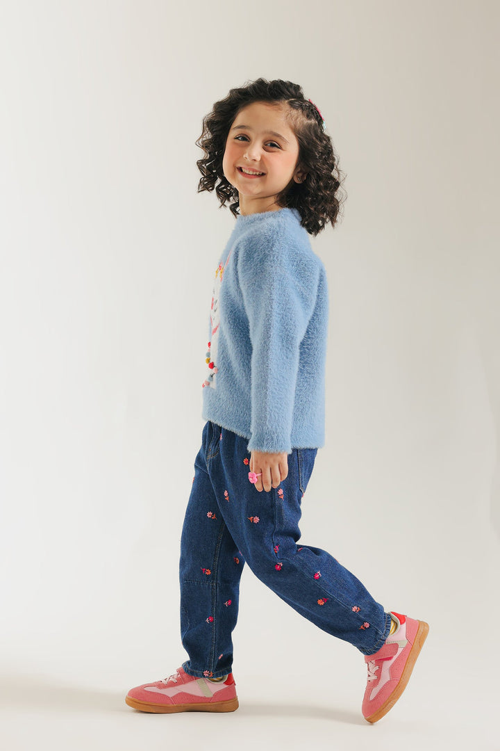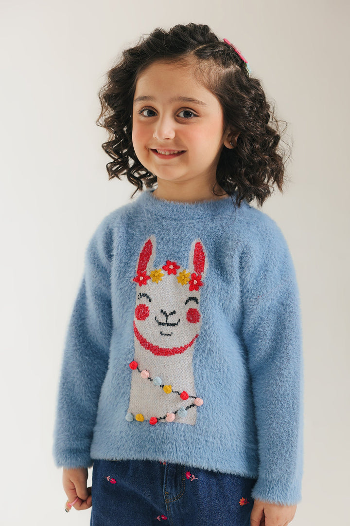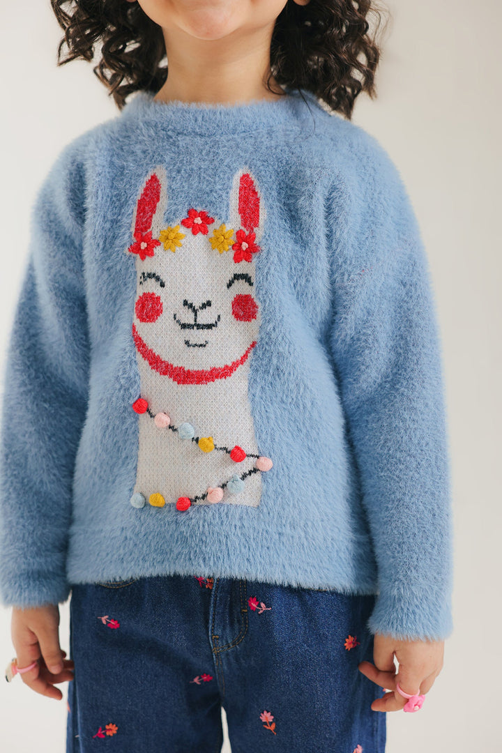 Unleash adorable winter cheer with this fluffy blue sweater. This cozy, soft-knit sweater features a cheerful llama graphic on the front. The bright blue color and fuzzy texture make it an instantly fun and warm choice for the chilly months. It can be paired with dark denim jeans that have a subtle floral embroidery, adding to the playful aesthetic.