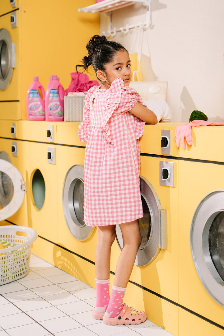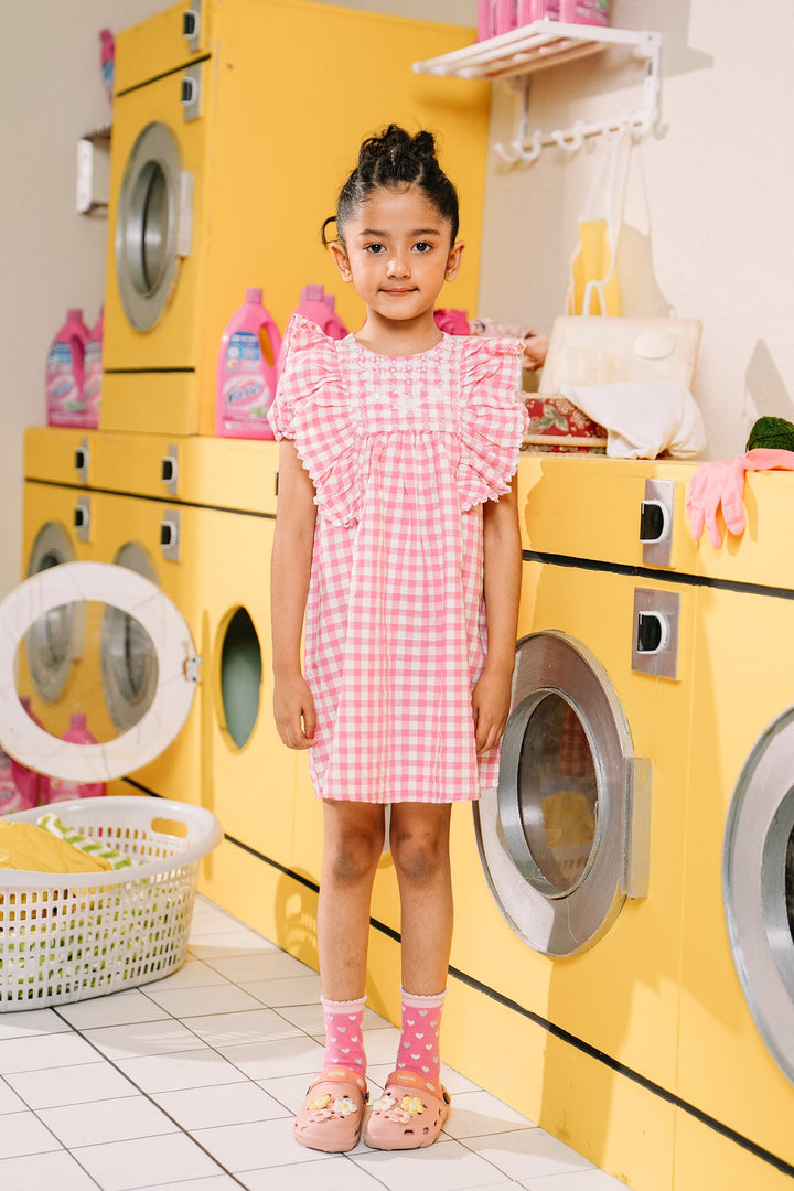 A classically elegant design is portrayed on this contemporary dress rendered in an appealing bubblegum shade and adorned with checkered prints in subtle hues. Crafted in a trendy silhouette with frills at shoulders and adorned with intricate embroidery at front yoke, this elegant dress is a great addition to your girls' summer wardrobe.