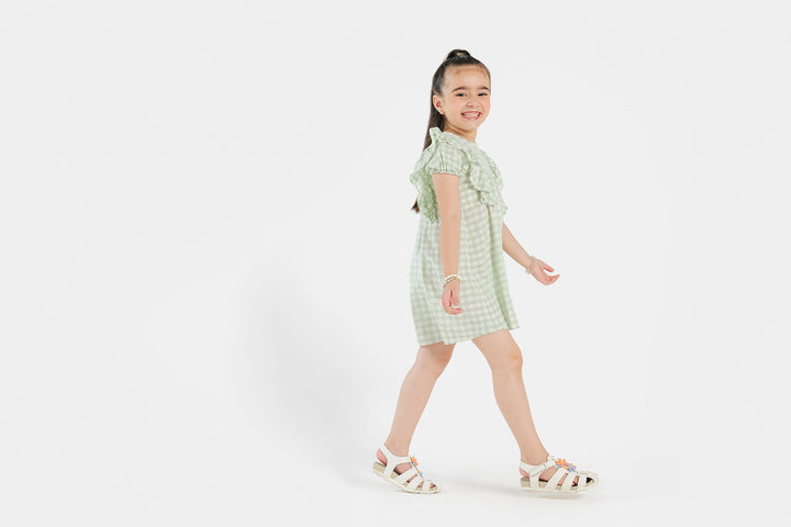 A classically elegant design is portrayed on this contemporary dress rendered in an appealing bubblegum shade and adorned with checkered prints in subtle hues. Crafted in a trendy silhouette with frills at shoulders and adorned with intricate embroidery at front yoke, this elegant dress is a great addition to your girls' summer wardrobe.