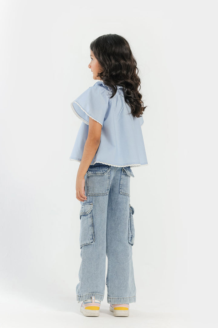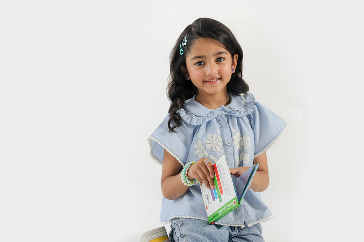 Dress your little one in adorable style with this charming sky-blue top, perfect for sunny days and playful adventures! This delightful shirt features a crisp, rounded collar adorned with delicate ruffles, adding an irresistible touch of sweetness. The main bodice features a embroidered front and a button-down placket giving it a more classy silhouette. Pair it with jeans, shorts, or a skirt for a versatile outfit that's perfect for playdates or family outings.