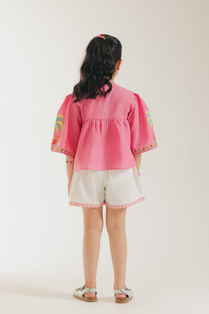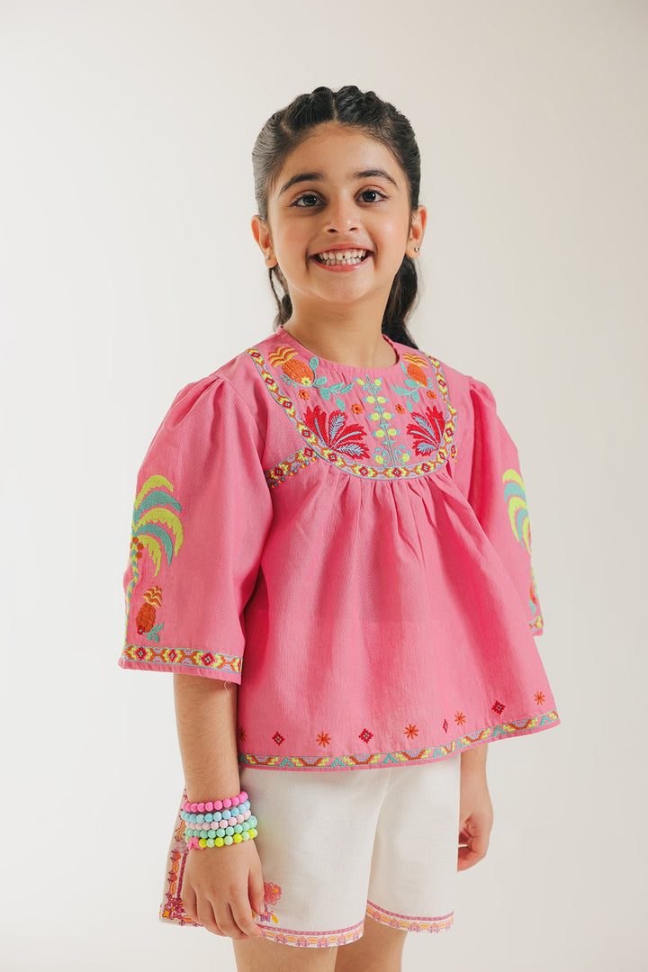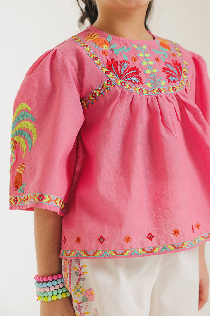 Brighten her day with this vibrant pink embroidered top! A riot of colorful blooms dances around the neckline and across the bodice. The short sleeves have a lovely, voluminous shape, creating a stylish and playful silhouette. Crafted from lightweight fabric for ultimate comfort, it's perfect for warm weather adventures or adding a pop of color to any outfit. Pair it with shorts, skirts, or jeans for a fun and fashionable look that celebrates individuality.
