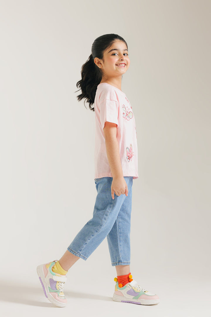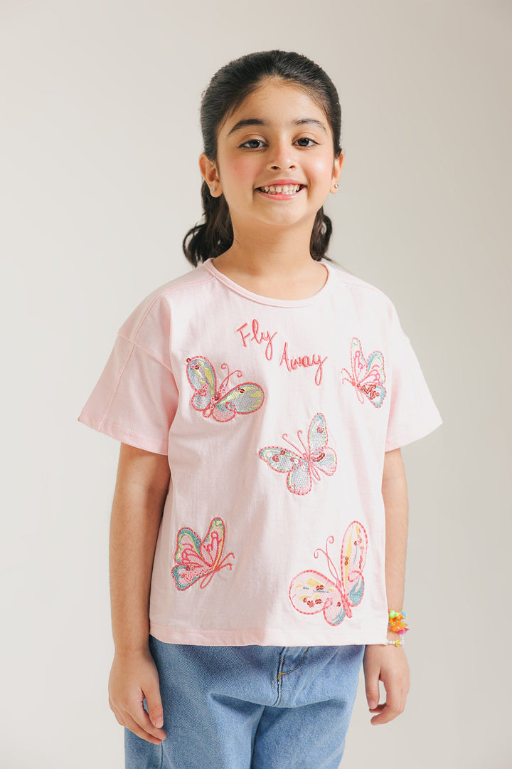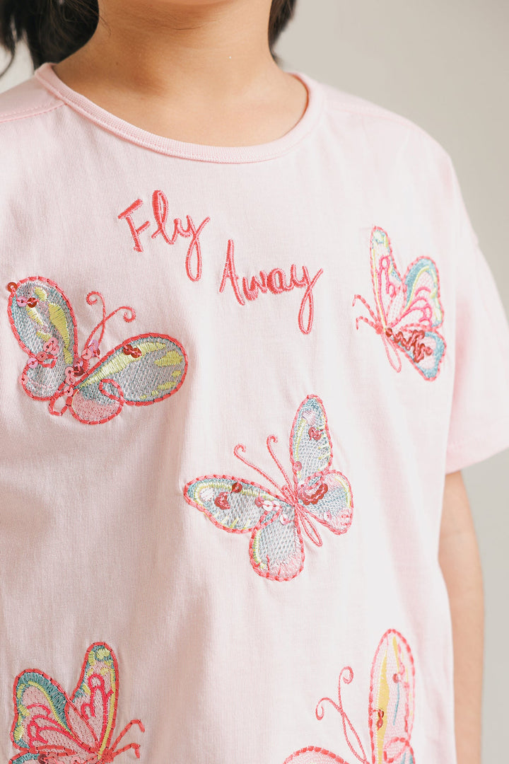 Let your little one's imagination take flight with this charming pink t-shirt. Featuring a whimsical design with delicate butterflies and the word "Fly Away," this top adds a touch of sweetness to any outfit. The soft pink hue and comfortable fit make it perfect for everyday adventures.