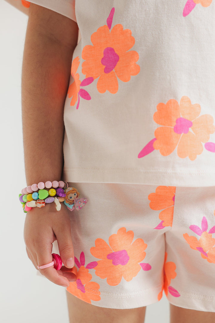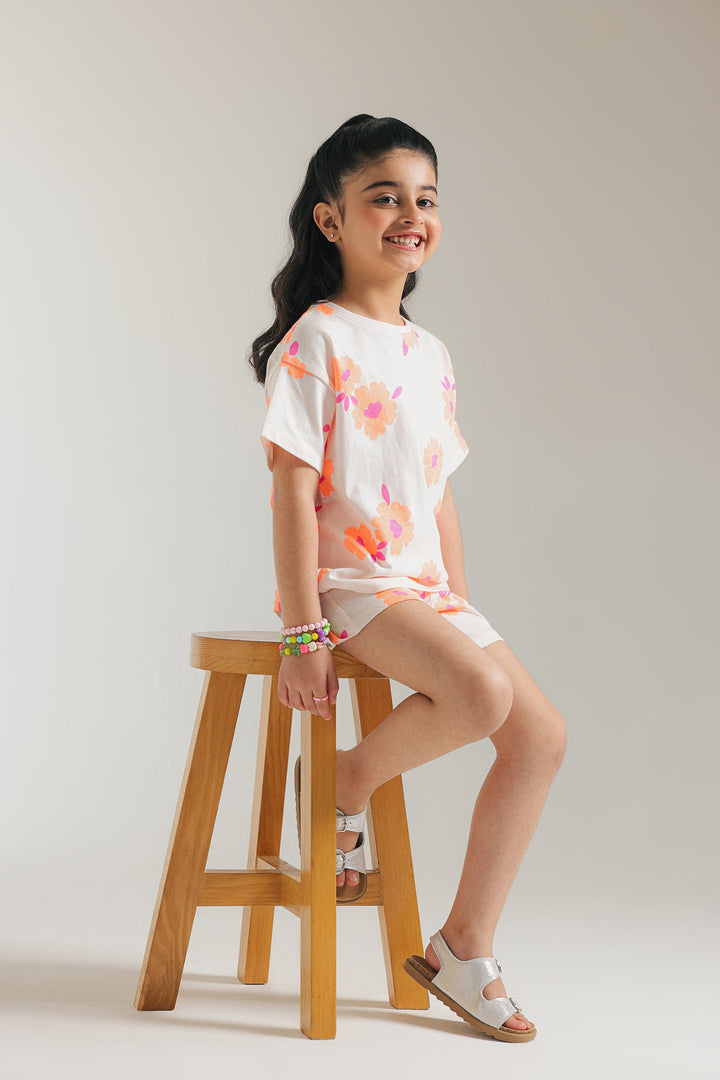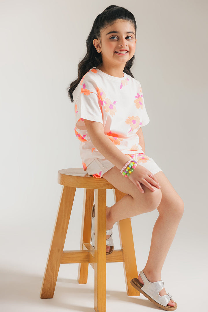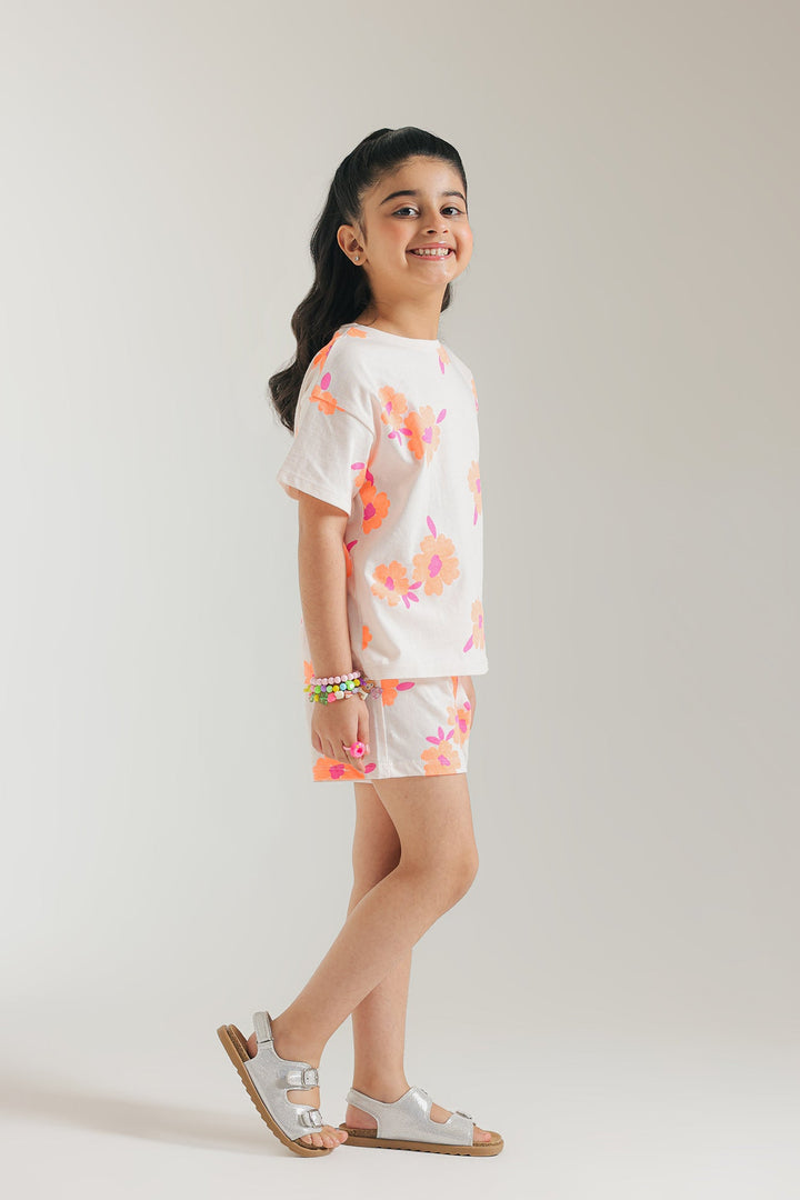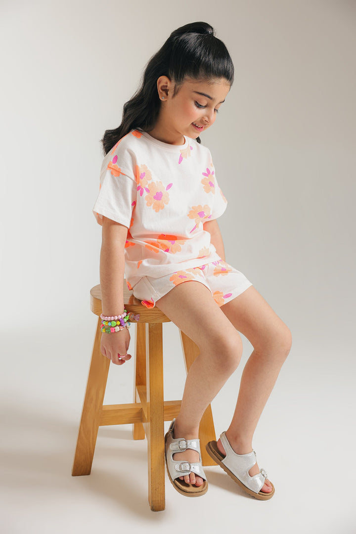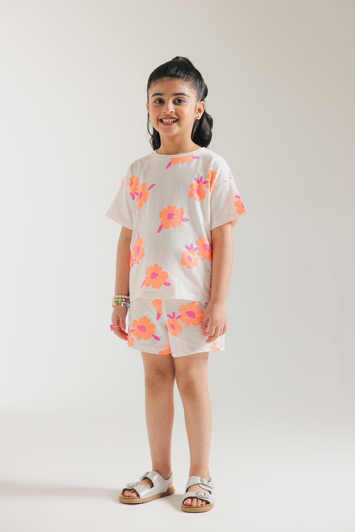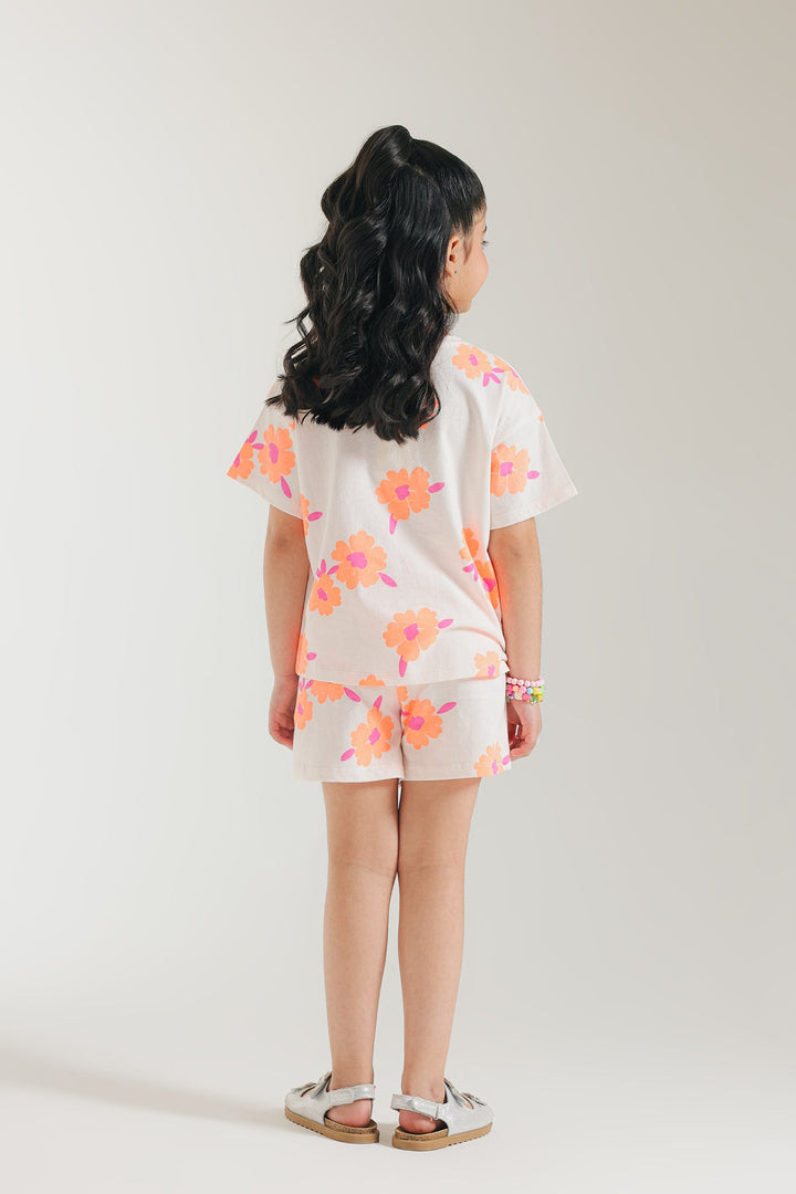 This trendy co-ord set features a light pink canvas beautifully adorned with mesmerizing floral prints in bright colors. It features a contemporary top with round neck and short sleeves. Made with comfortable materials for all-day wear.