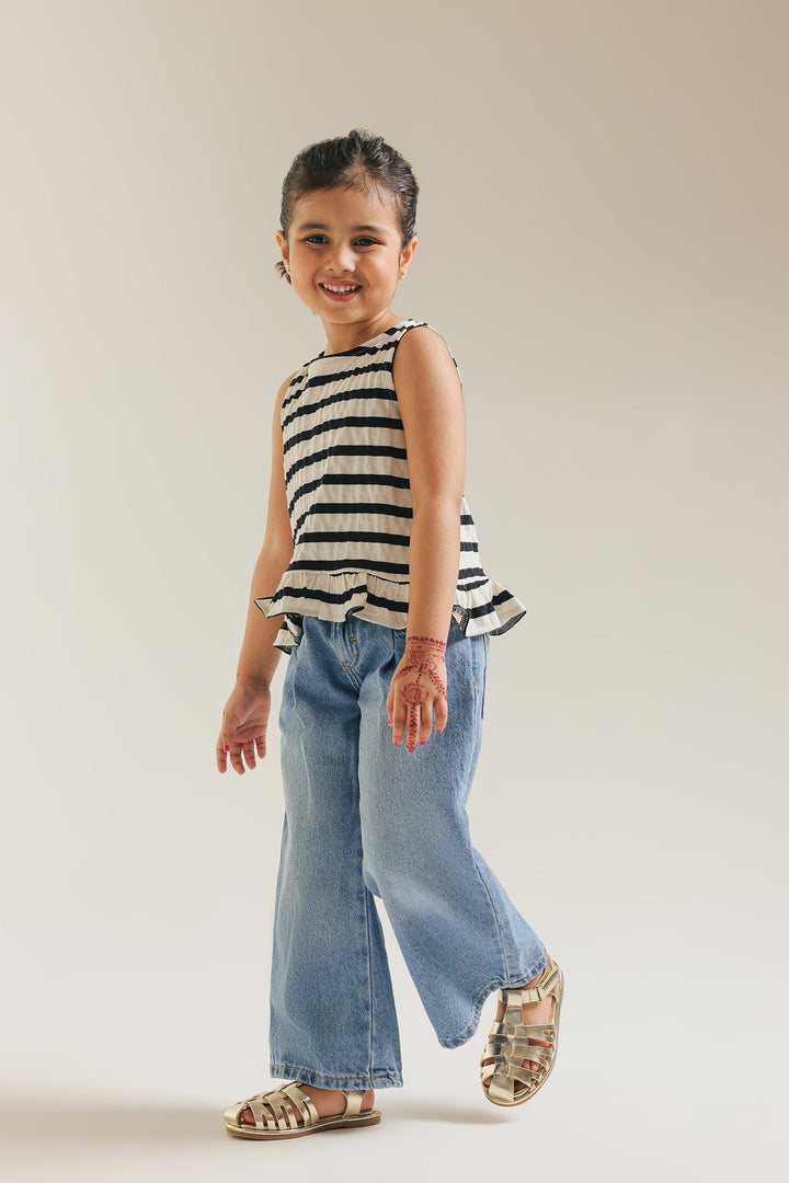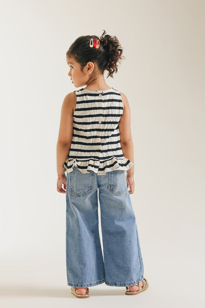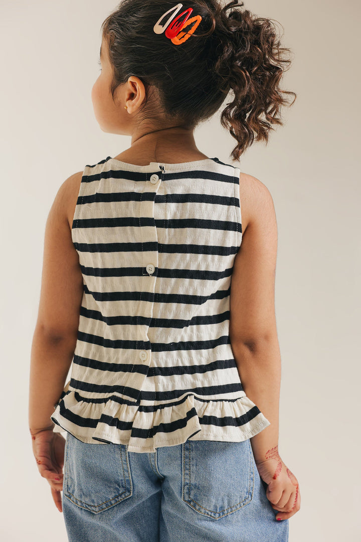 Get ready to twirl in style with our charming black & white striped peplum top! This delightful sleeveless shirt features timeless black and white horizontal stripes, perfectly accented by a playful, ruffled peplum hem that adds movement and flair. Crafted for comfort, its relaxed fit makes it ideal for warm days, school, or any occasion where she wants to look effortlessly chic and feel great.