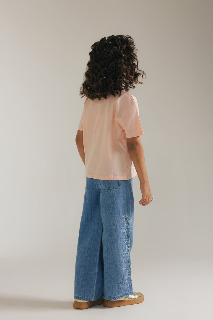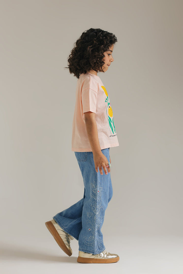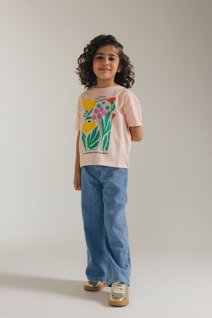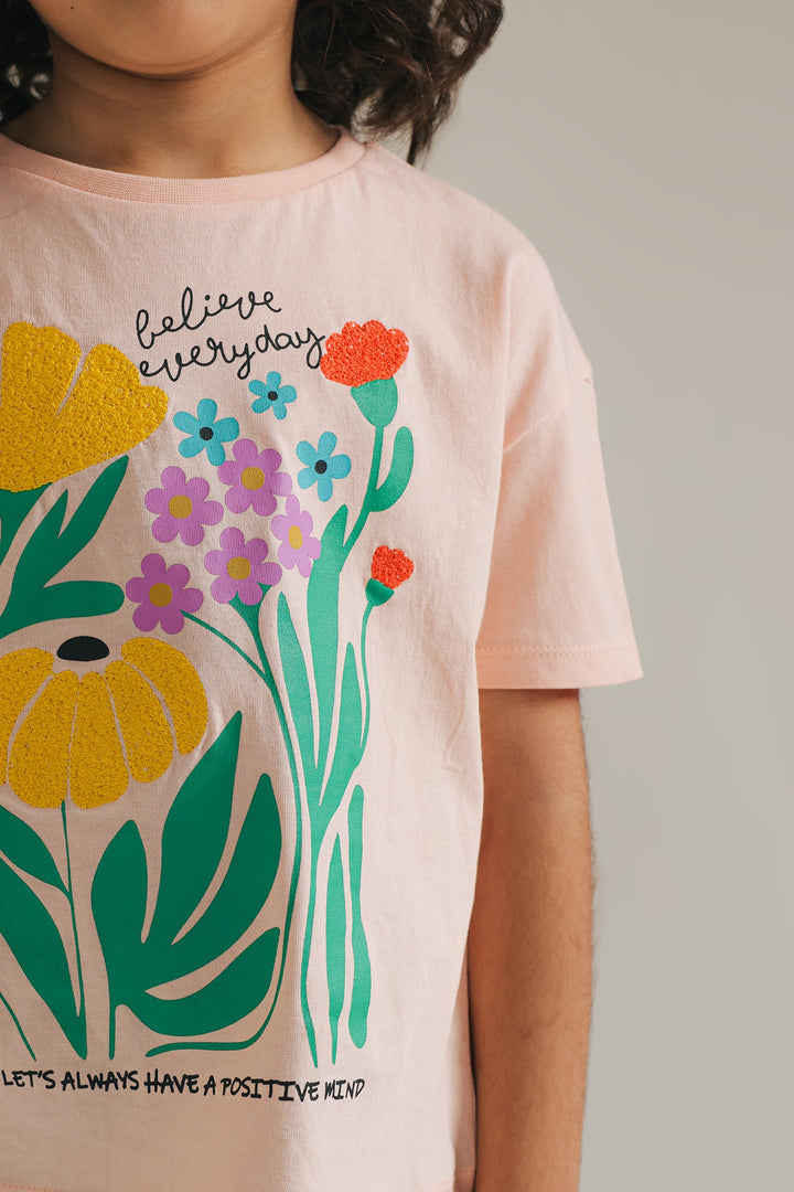 This casual pink top features a vibrant floral graphic and an uplifting message: "believe every day." Pair it with blue denim jeans to complete the outfit for play date.