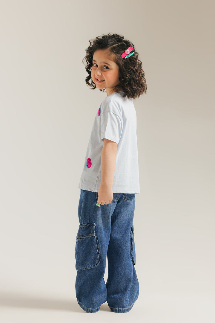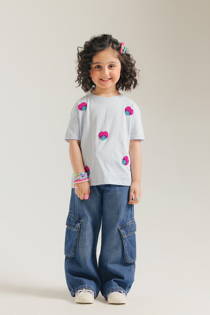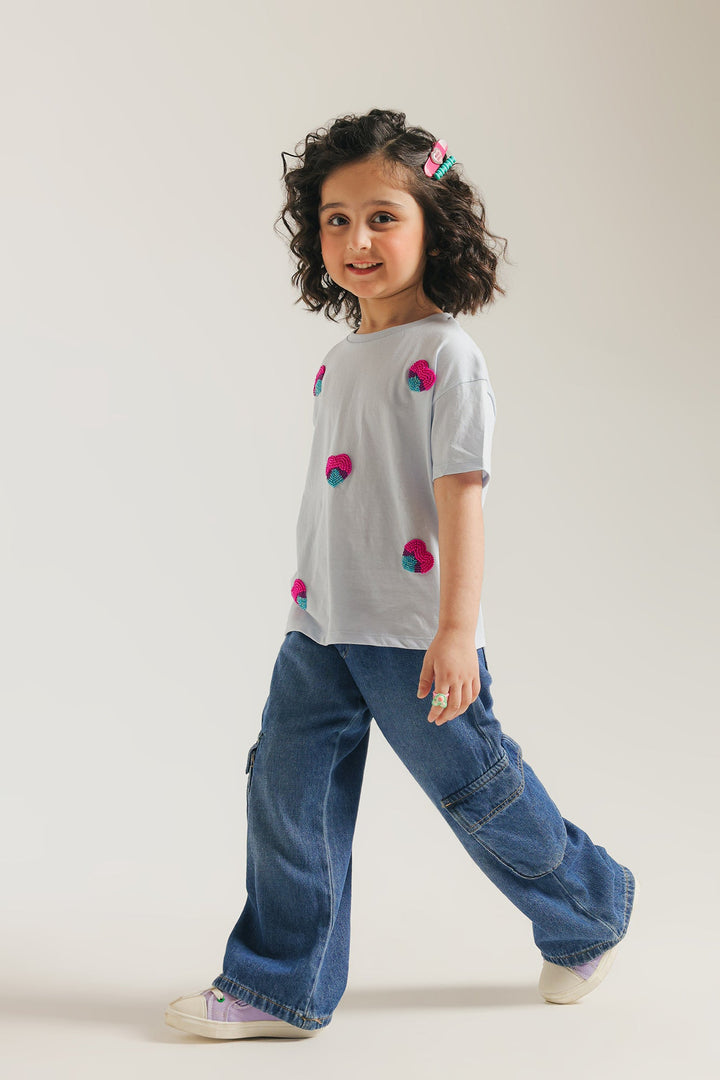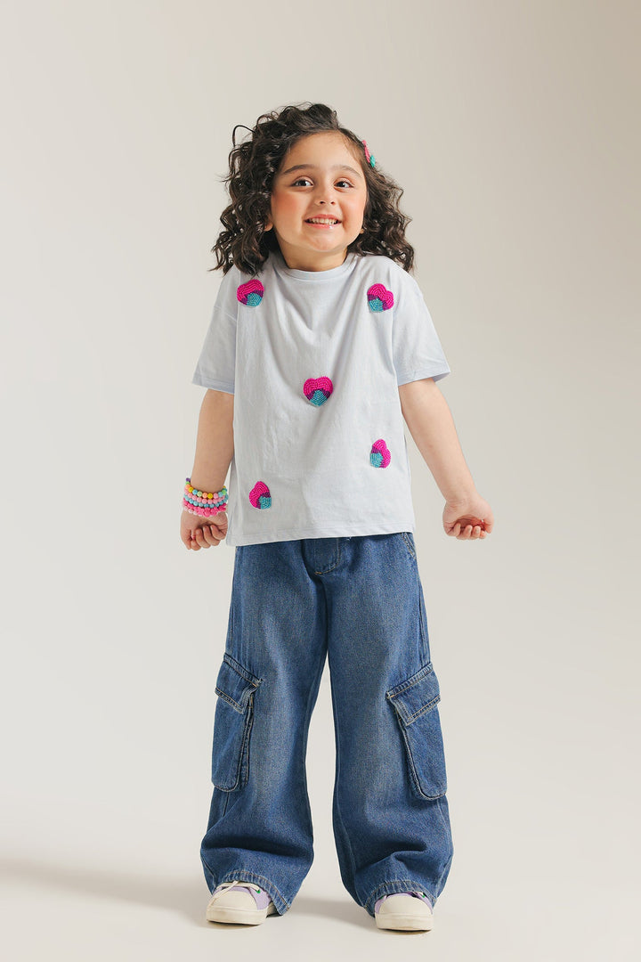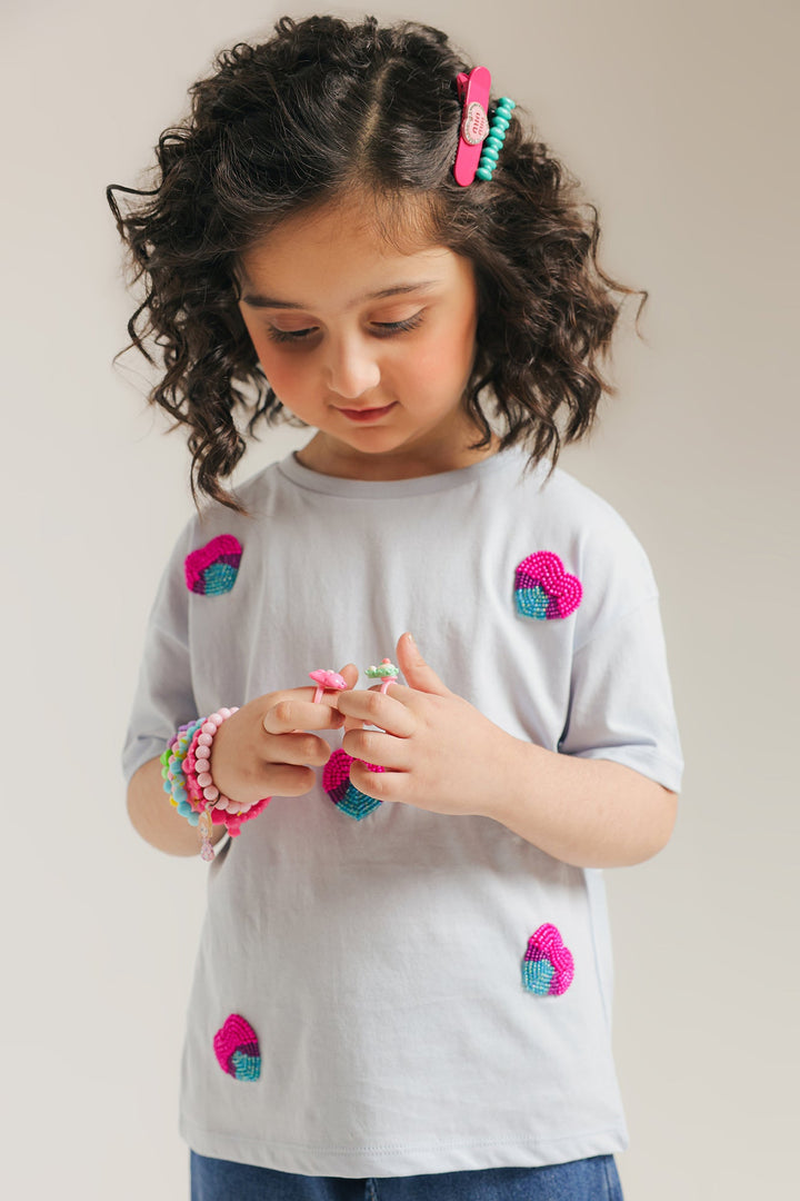 Dress her in this fun and playful light blue T-shirt, perfect for adding a pop of color to her day. This comfy tee features vibrant pink and turquoise beaded hearts scattered across the front, giving it a unique, handcrafted feel. Made from soft, breathable fabric, it's ideal for school, play, or any casual outing where she wants to show off her cheerful style.
