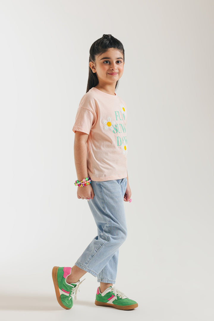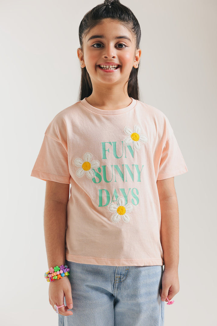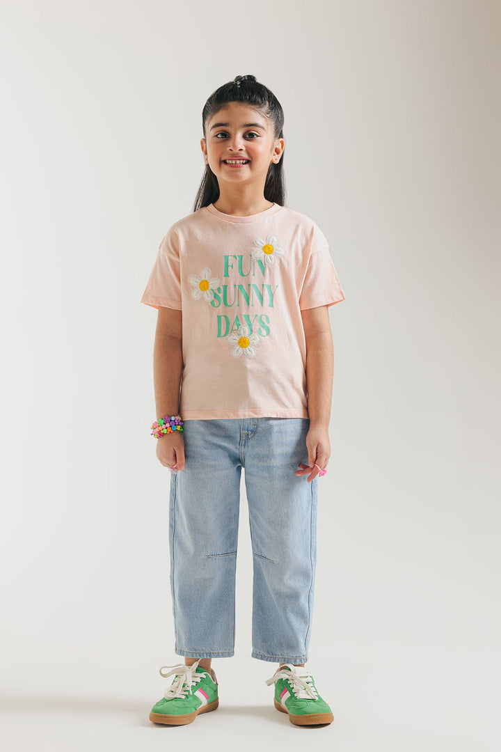 Let your little one bloom in style with this charming light pink tee. The short-sleeved top features a sweet message "FUN SUNNY DAYS" in a fun teal font, framed by embroidered white flowers. Crafted for a relaxed fit, it ensures breathable comfort for all their adventures. This tee is ideal for casual outings, playdates, or adding a distinctive and joyful flair to your child's everyday style.