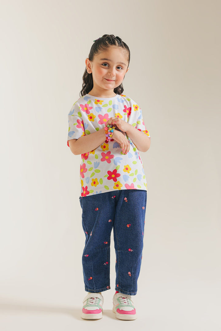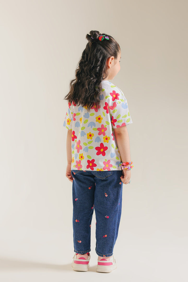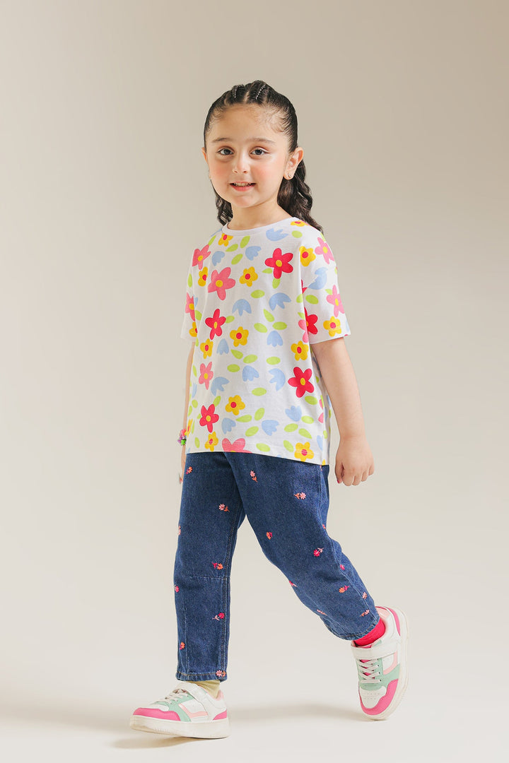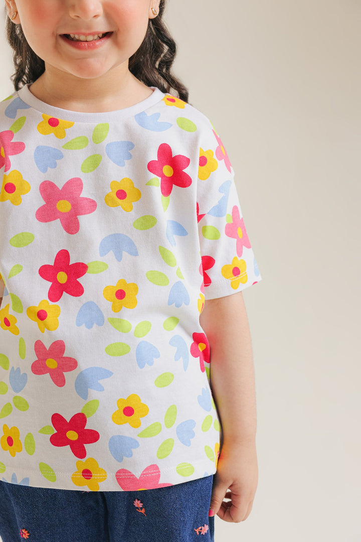 Bring a garden of joy to her wardrobe with our vibrant all-over floral print tee! This super-soft white t-shirt features a cheerful, all-over print of colorful flowers in shades of pink, yellow, light blue, and red, creating a lively and delightful look. With its comfortable, relaxed fit and easy short sleeves, this tee is perfect for everyday wear, ensuring she feels as bright and happy as she looks.