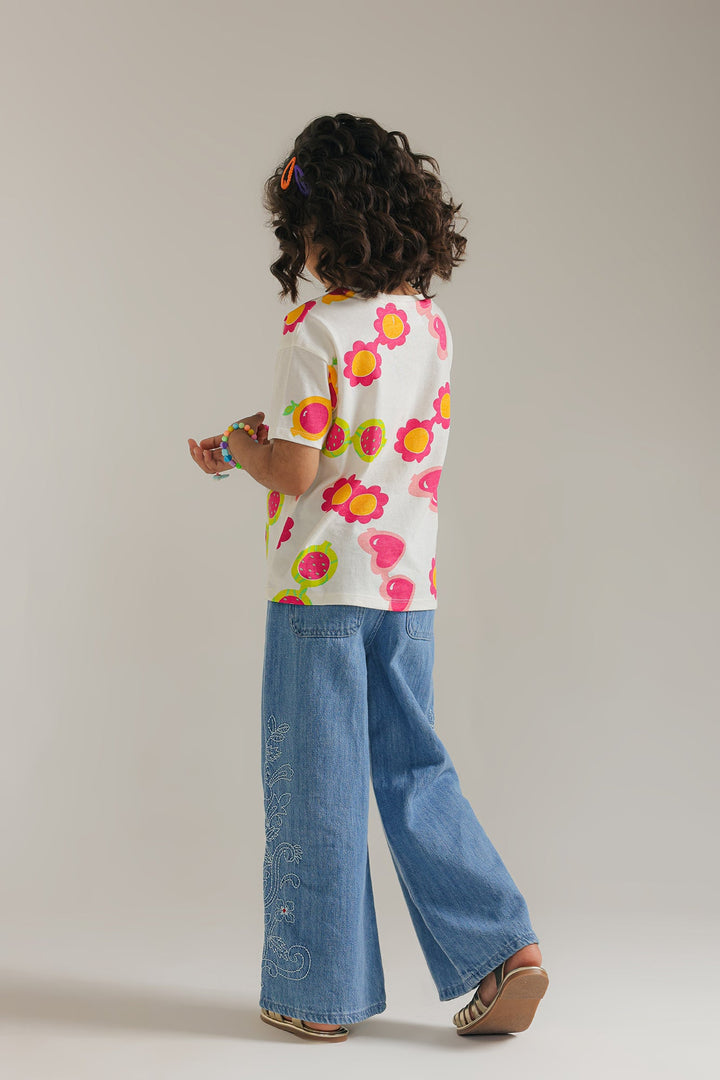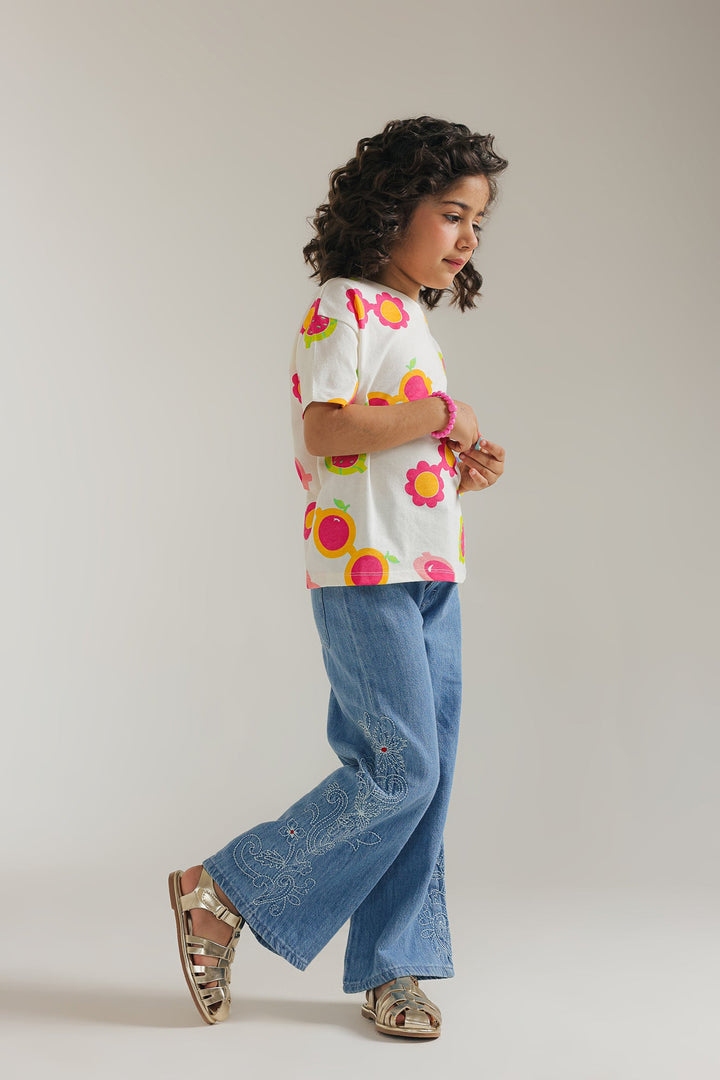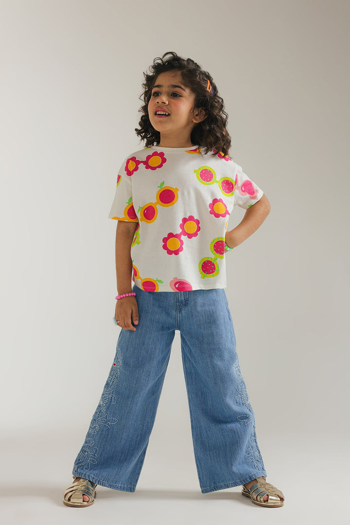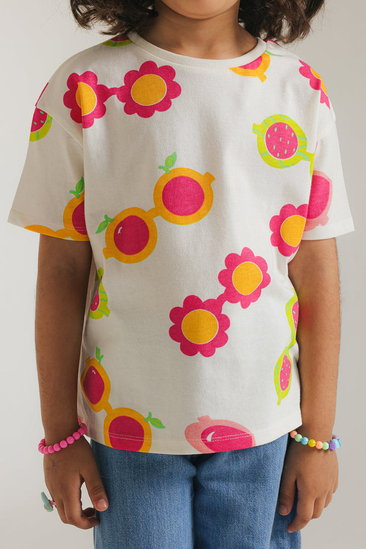 Add a splash of retro fun to any outfit with this playful off white top. Featuring a vibrant pattern of oversized sunglasses with colorful floral accents, this top brings a cheerful and whimsical vibe to your child's look. The comfortable, relaxed fit and short sleeves make it perfect for everyday adventures with a touch of groovy style.