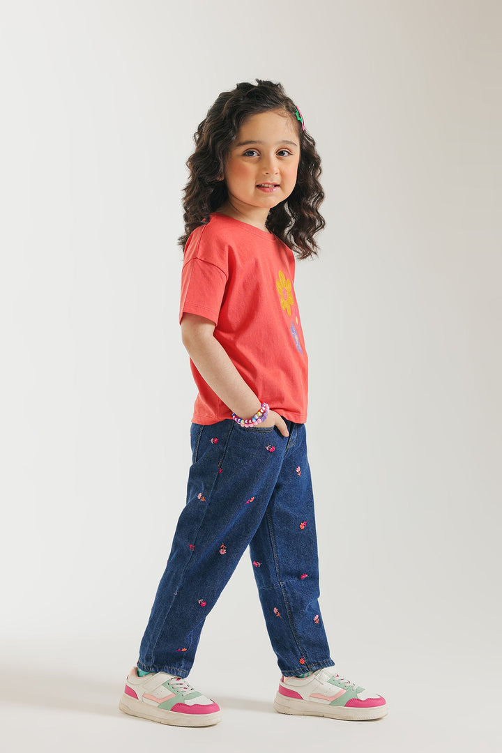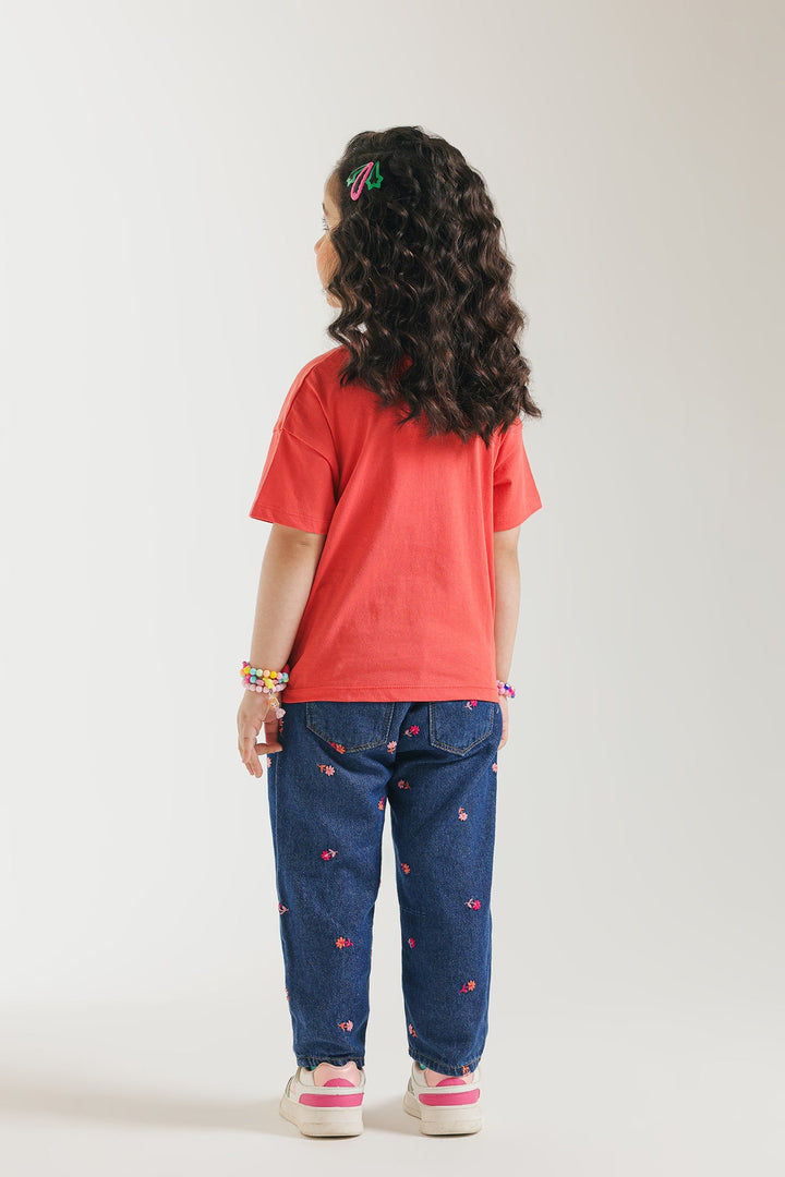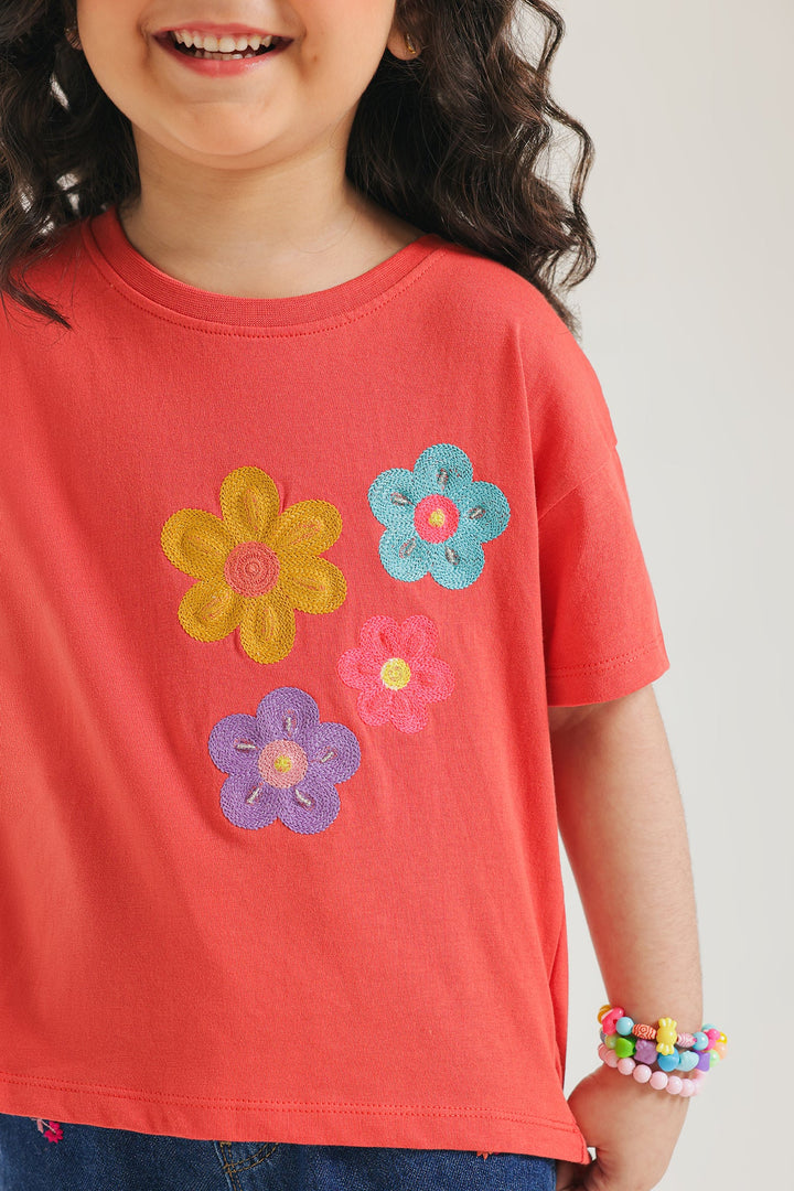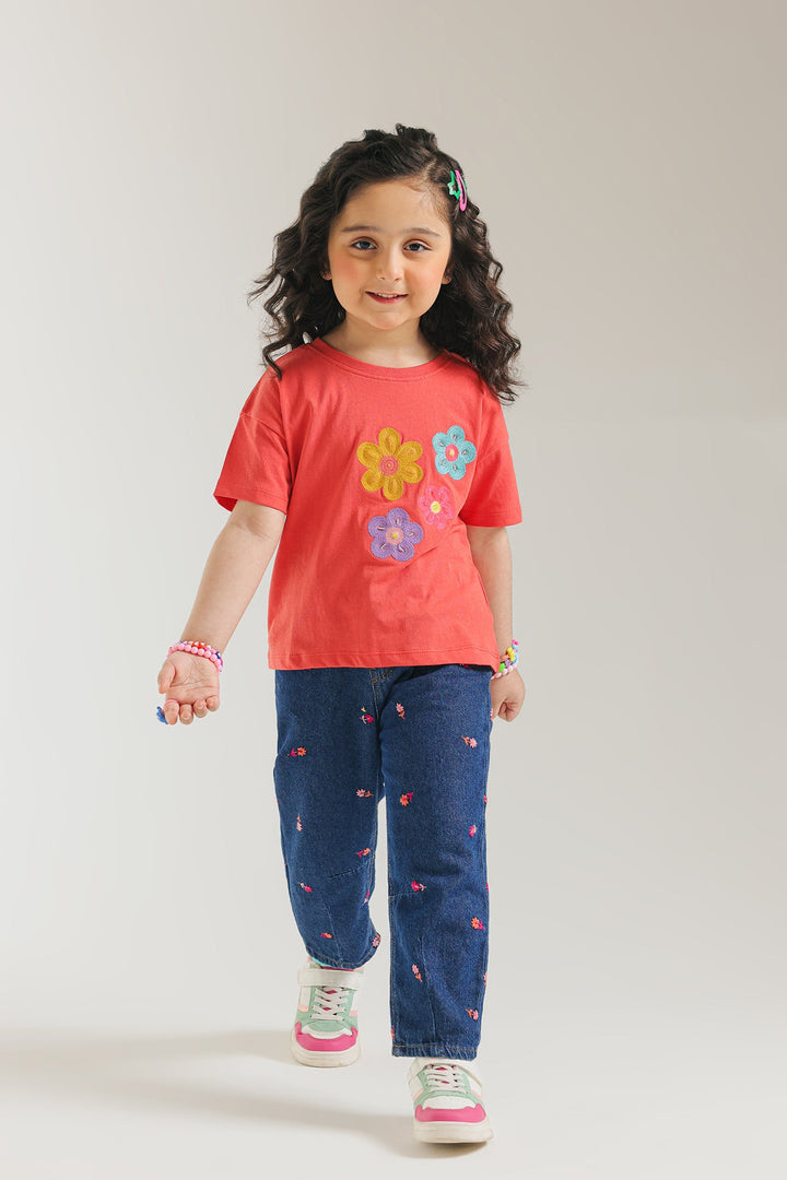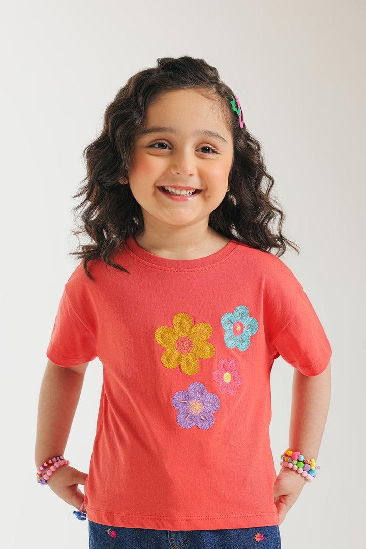 Brighten her day with this cheerful red T-shirt, designed for comfort and blooming style! This vibrant tee features three charming, multi-colored floral appliques on the front, adding a playful and artistic touch. Crafted from soft, breathable fabric in a relaxed short-sleeve fit, it's perfect for her everyday adventures, playdates, or simply adding a pop of joyful color to her look.