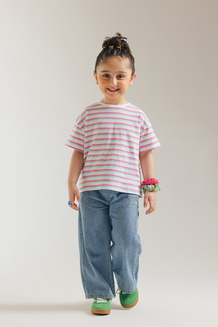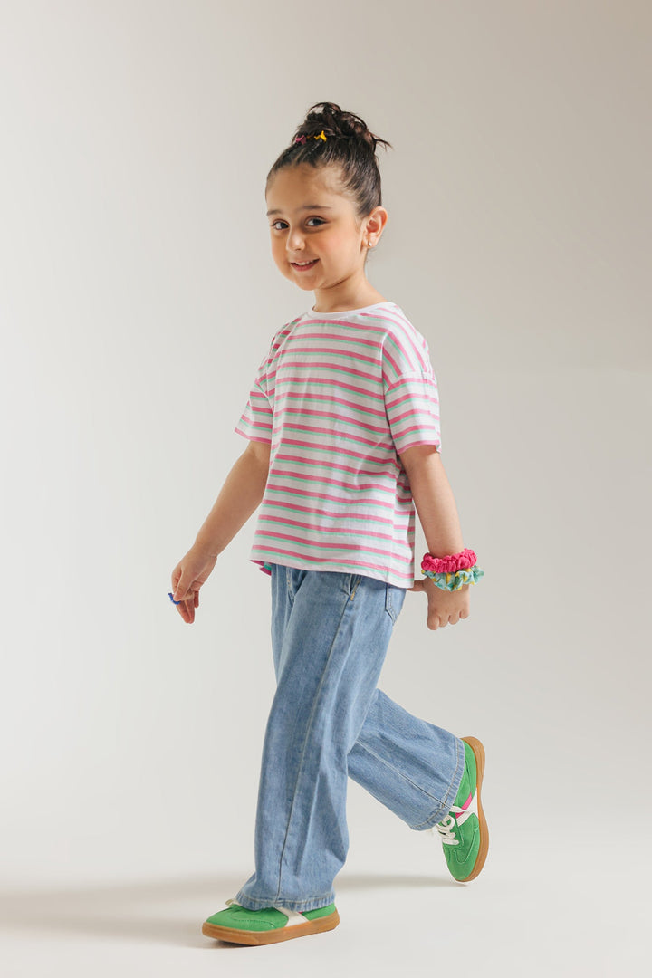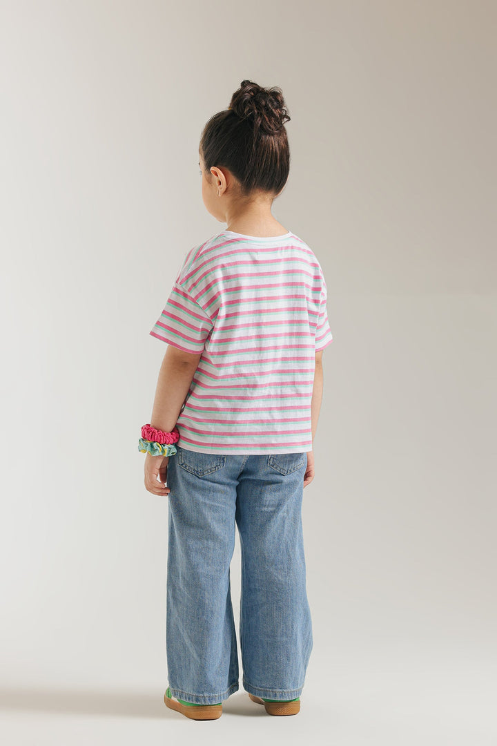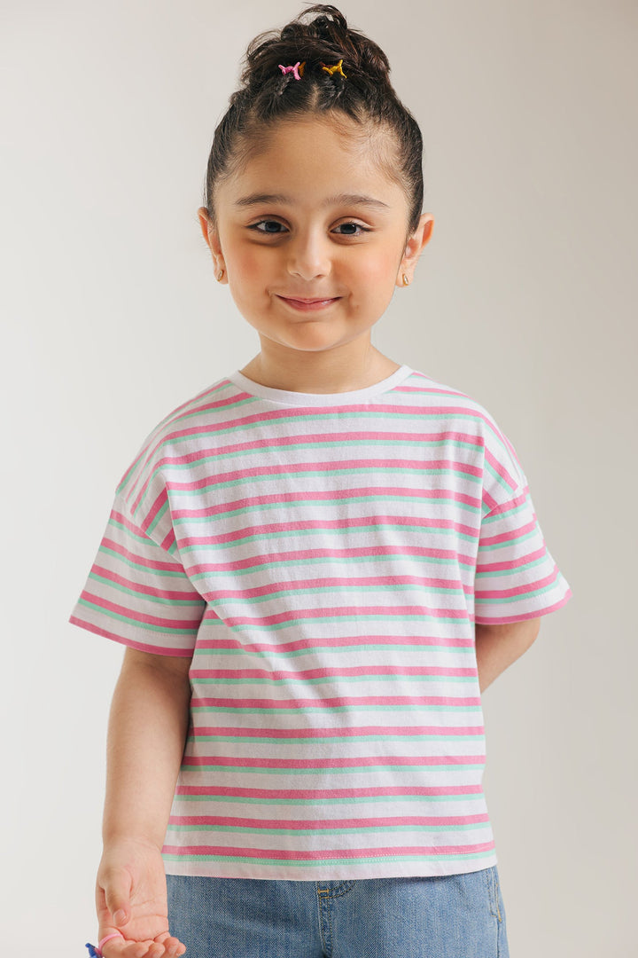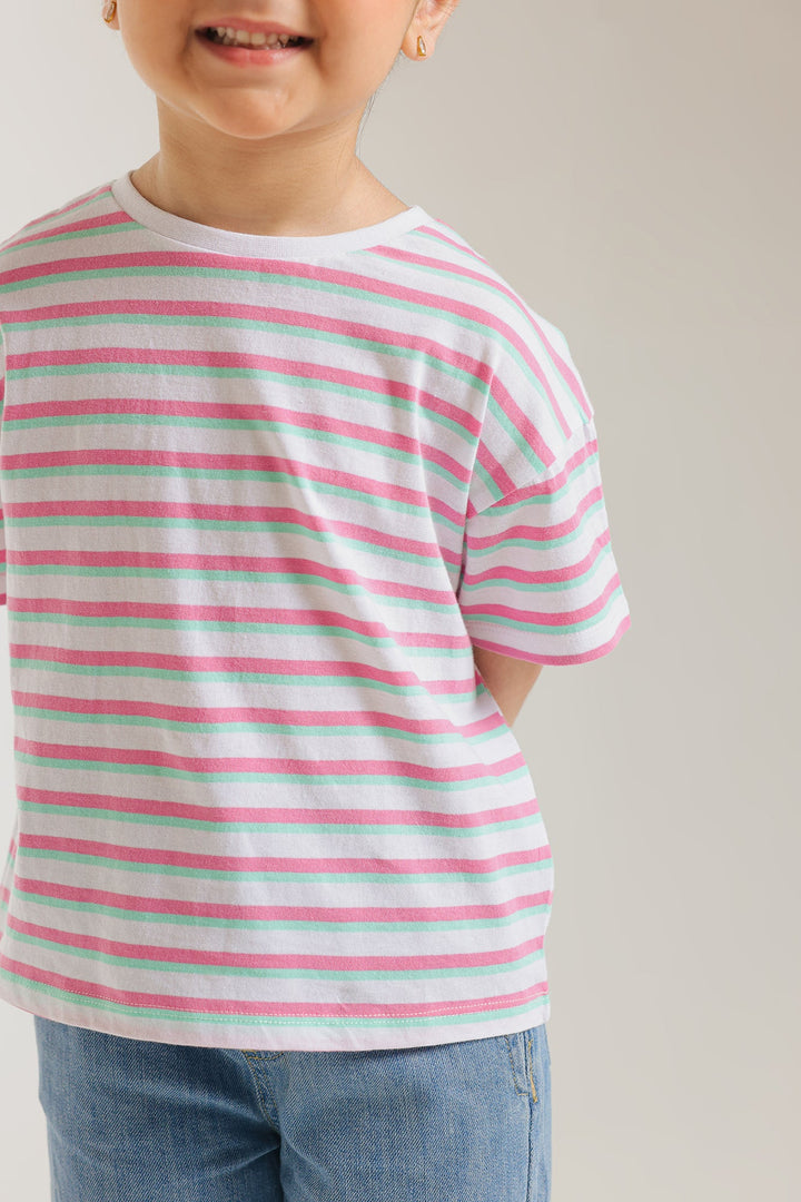 Add a touch of cheerful simplicity to her everyday look with this adorable striped T-shirt! This comfortable tee features charming horizontal stripes in soft shades of pink and mint green against a crisp white background, creating a fresh and playful design. Crafted from soft, breathable fabric in a relaxed short-sleeve fit, it's perfect for her casual adventures, playdates, or simply adding a sweet and vibrant touch to her look.