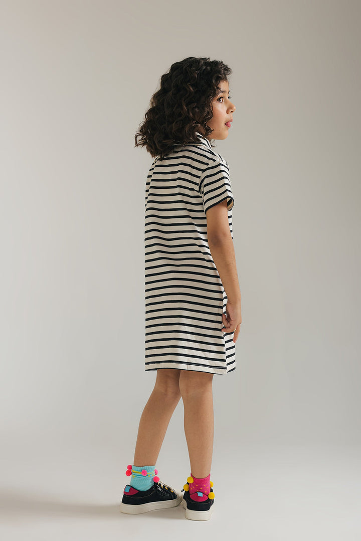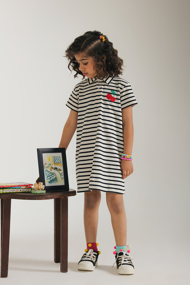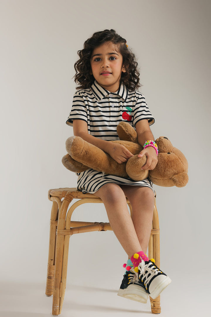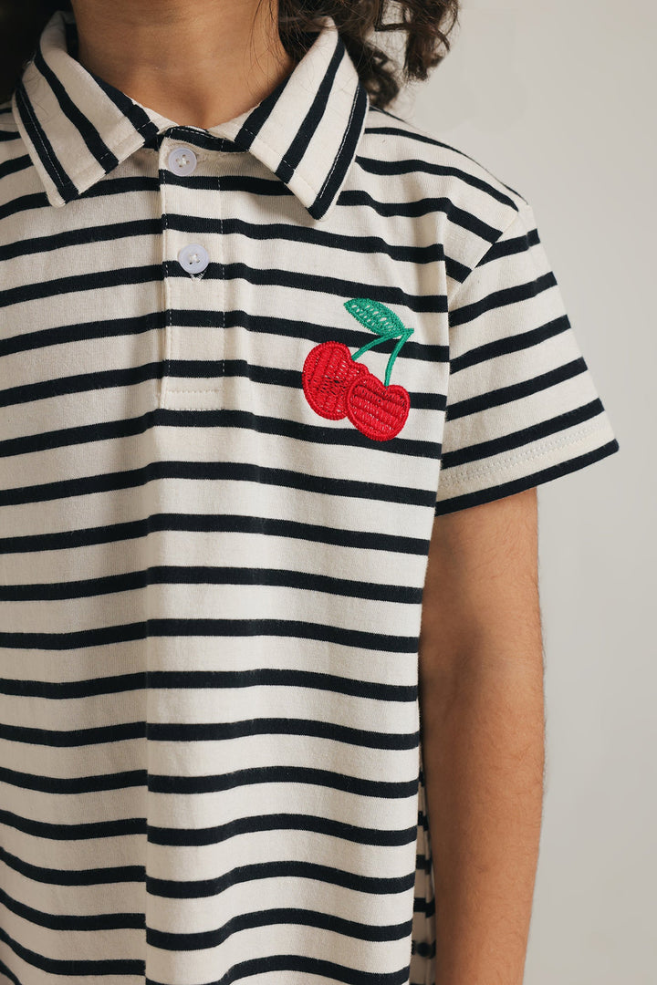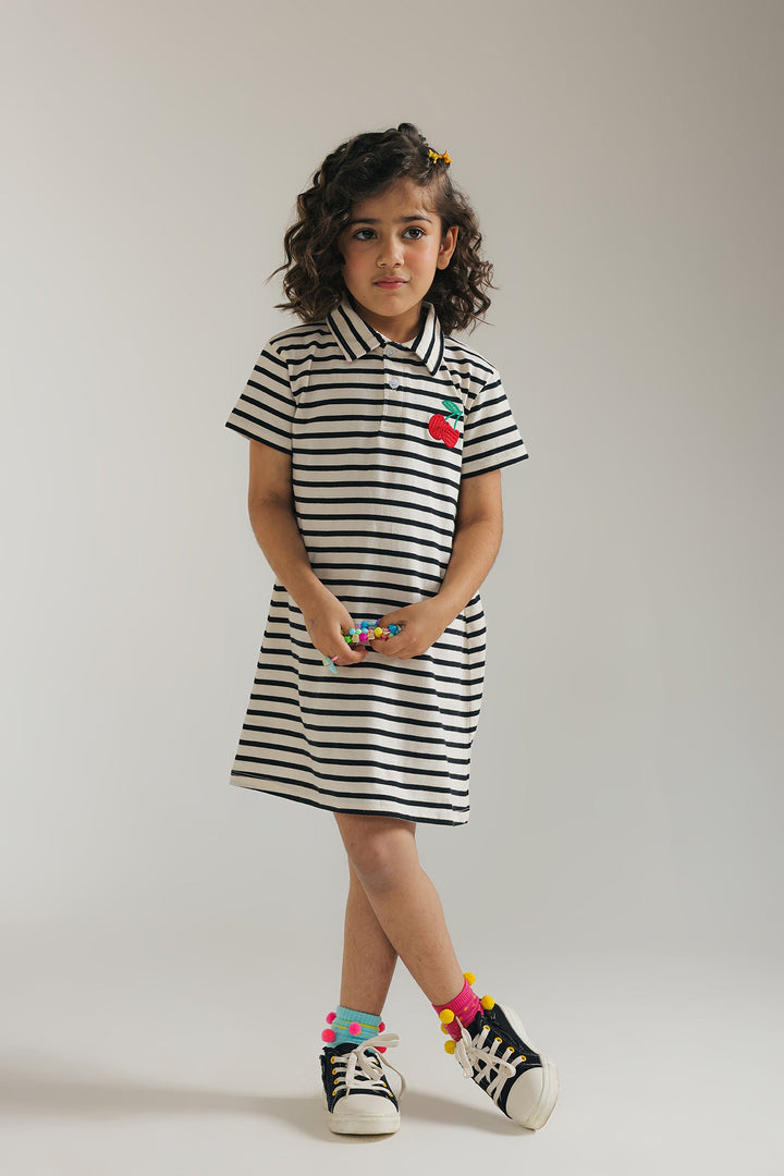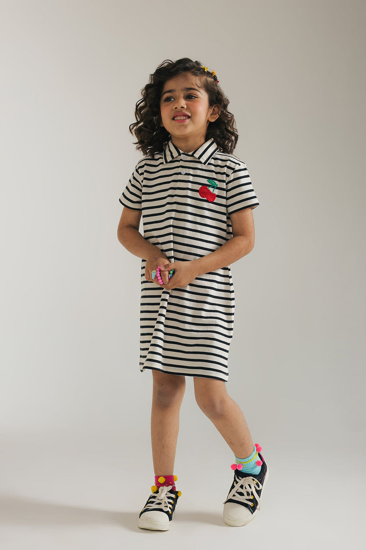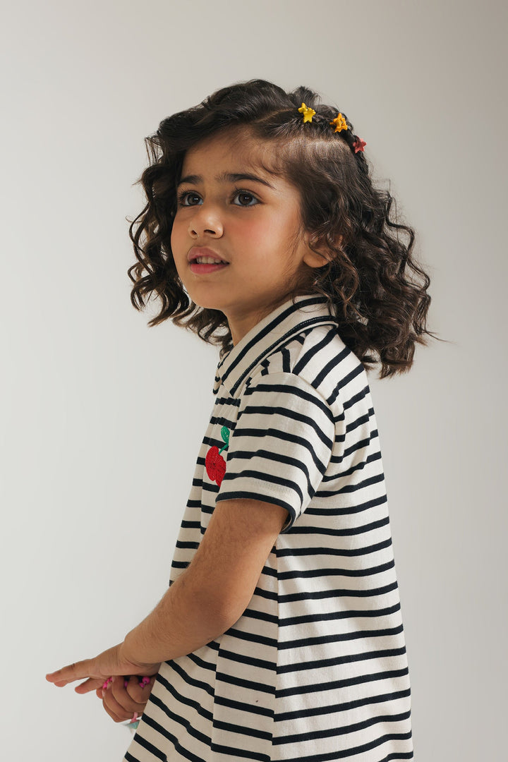 This t-shirt dress features a classic black and white striped pattern, perfect for adding a touch of sporty-chic to your little one's wardrobe. The collar-style neckline and short sleeves offer a comfortable and versatile fit, while a playful cherry detail adds a touch of sweetness.