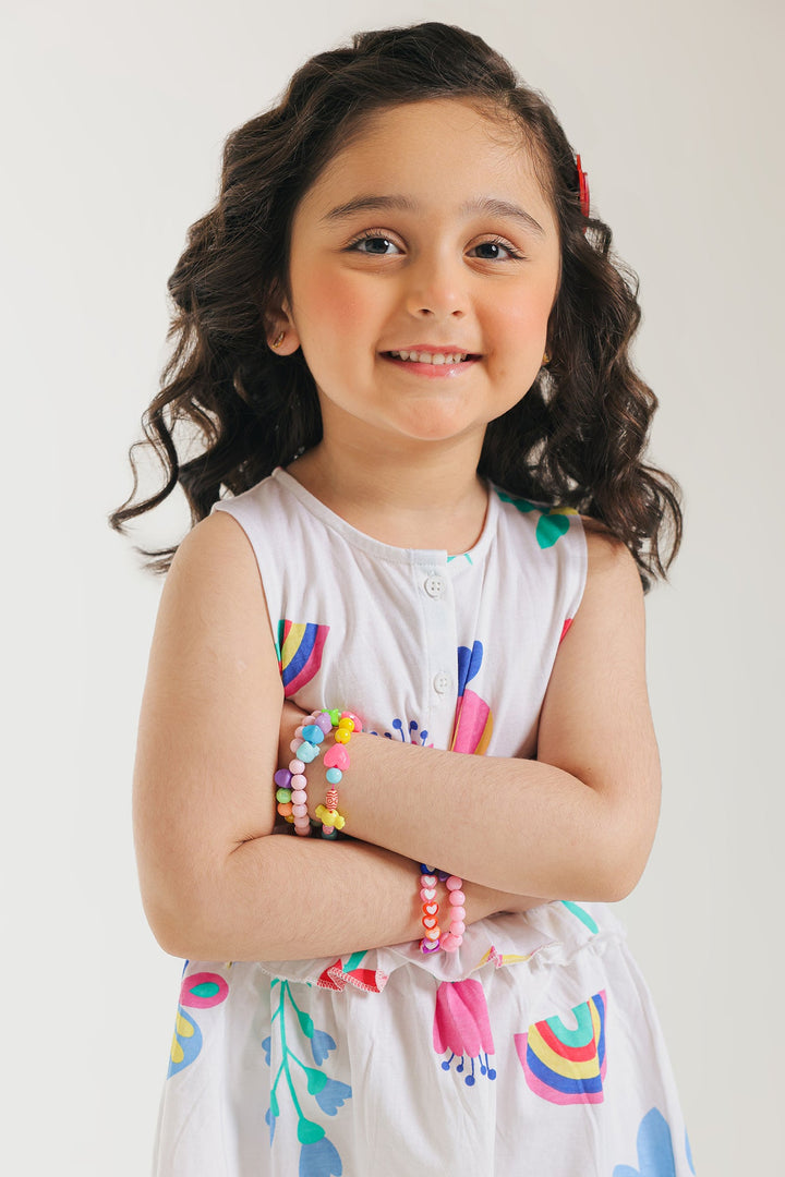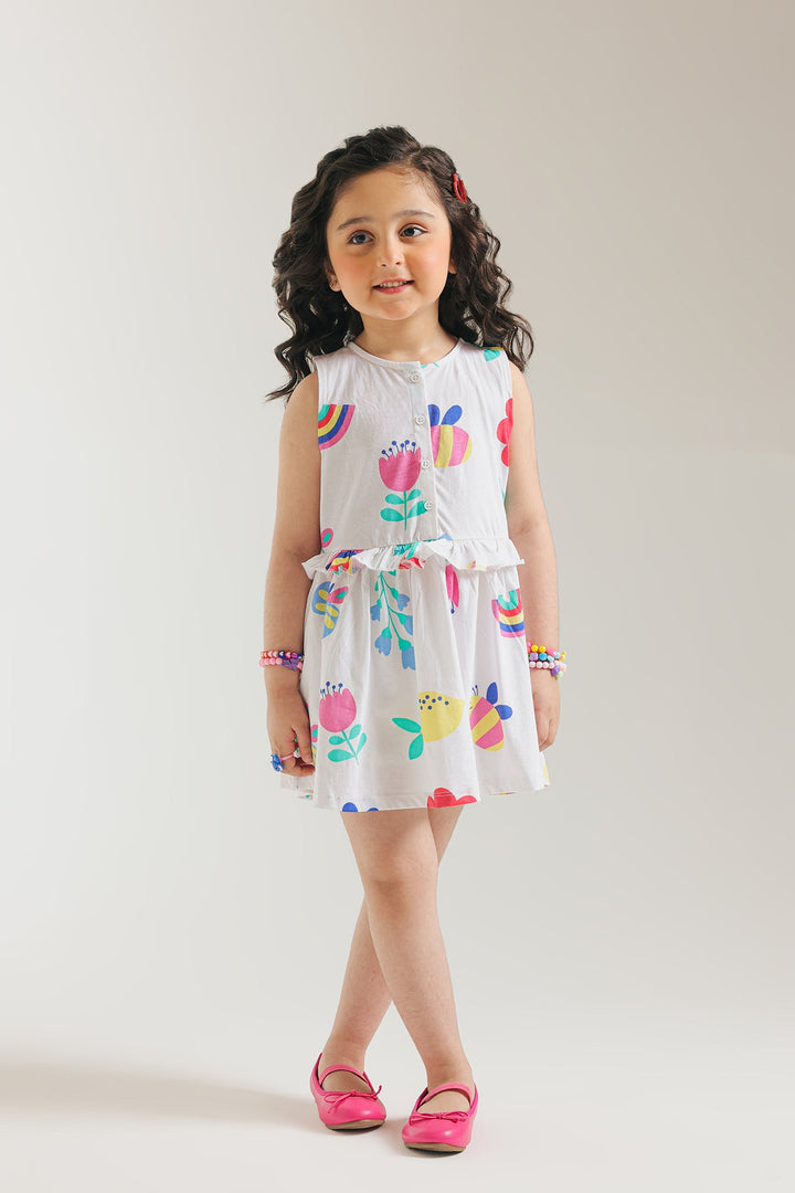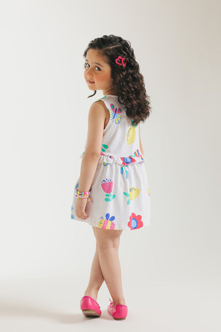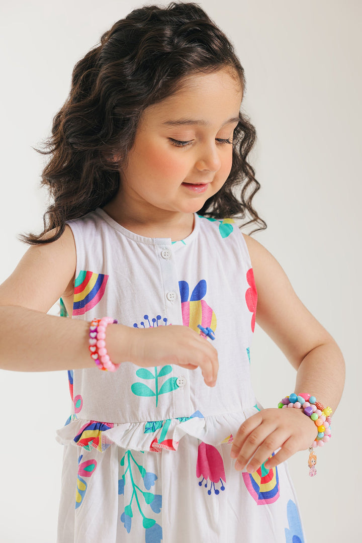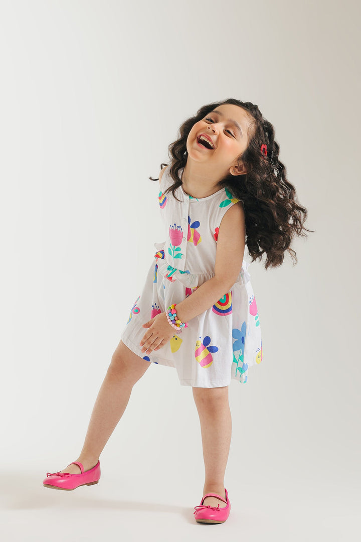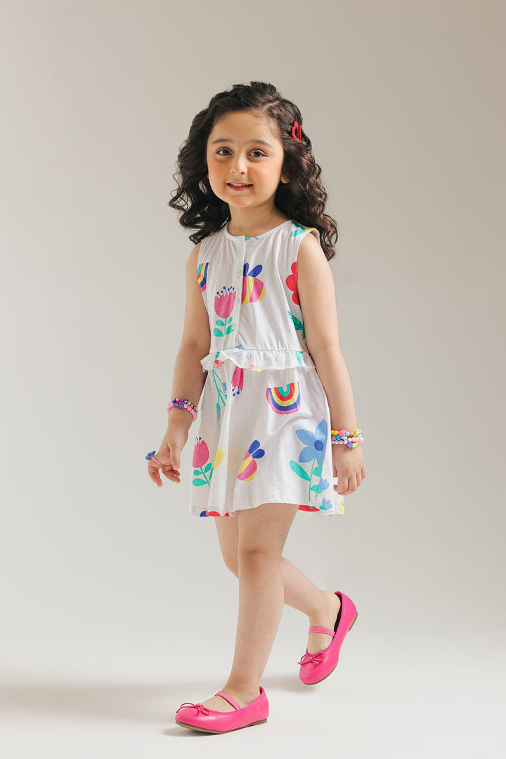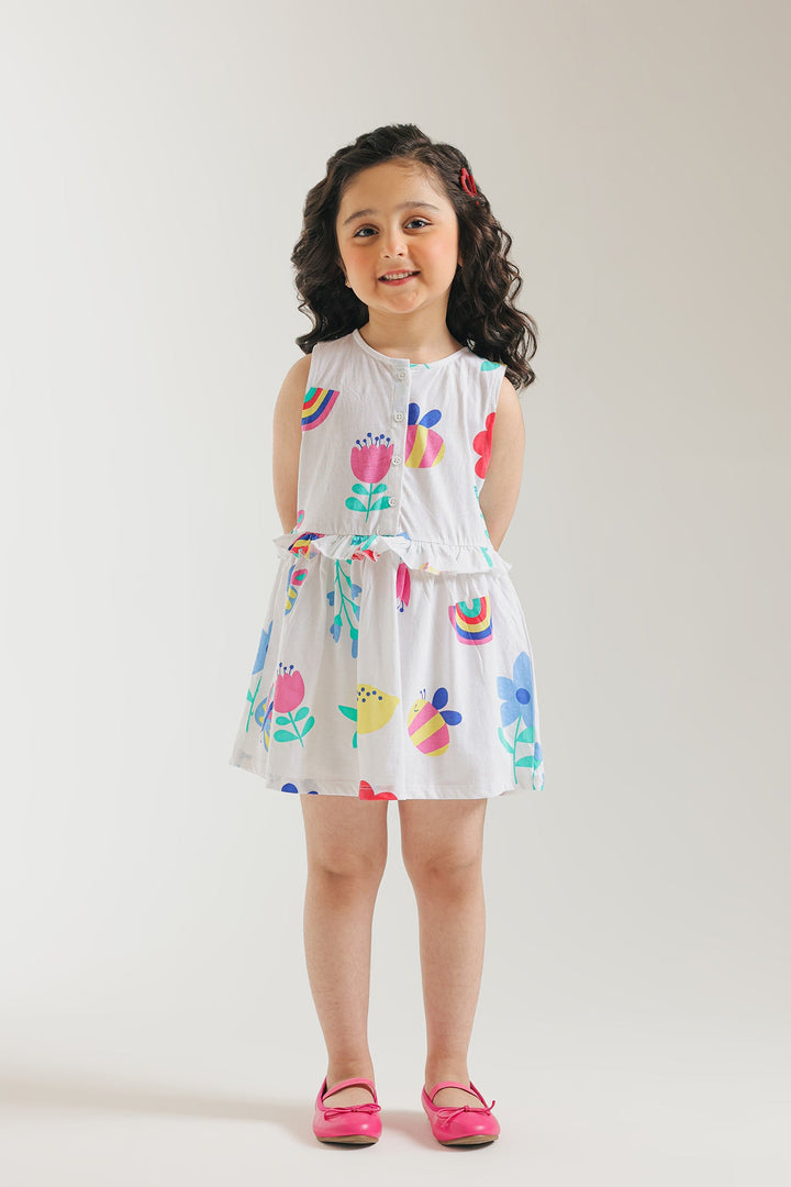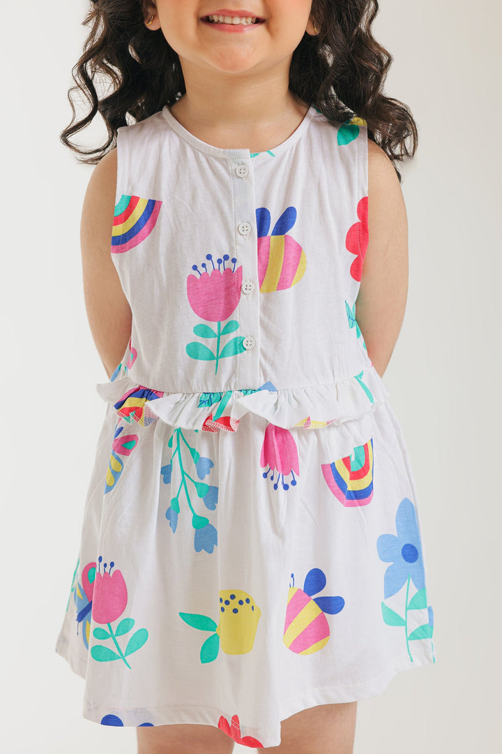 Dress her in delightful charm with this adorable white sleeveless dress, perfect for sunny days and carefree play! This cheerful dress features a whimsical all-over print of colorful flowers and vibrant shapes, creating a lively and imaginative design. With its comfortable fit, button-down front, and cute ruffled tier, it's ideal for everyday wear, playdates, or adding a sweet and vibrant touch to her look.