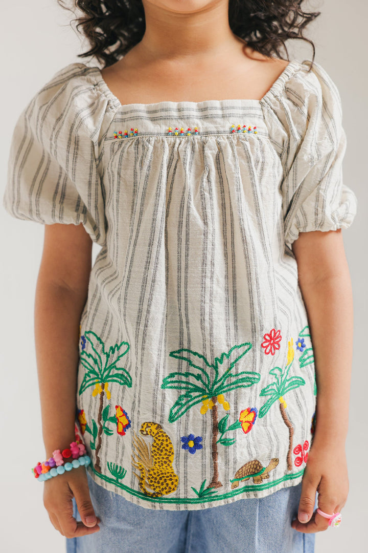 This top is made with a trendy square neck design and showcases exquisite embroidery depicting trees, flowers and animal. It is crafted from top-quality materials and effortlessly combines fashion and comfort. Add a touch of refinement to your wardrobe with this versatile and sophisticated piece.