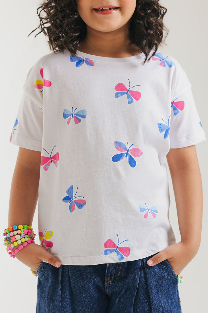 Let your little one's spirit soar with this enchanting white graphic tee, a whimsical tribute to colorful butterflies! This short-sleeved top is adorned with numerous charming butterfly motifs in vibrant shades of pink, blue, yellow, and red, creating a cheerful and lively design. Crafted for a relaxed fit, it ensures breathable ease for all their adventures. This tee is ideal for casual outings, playdates, or adding a distinctive and joyful flair to your child's everyday style.