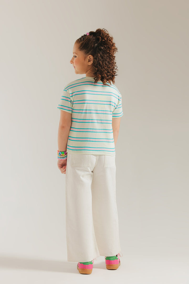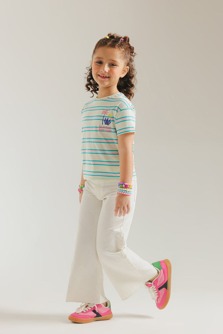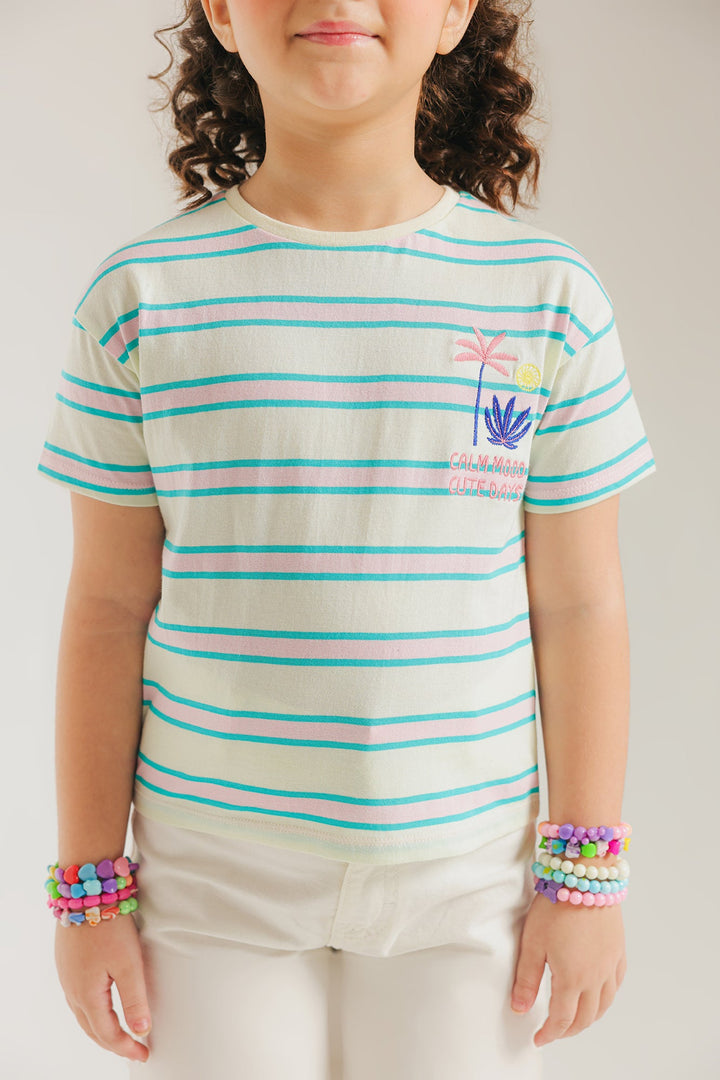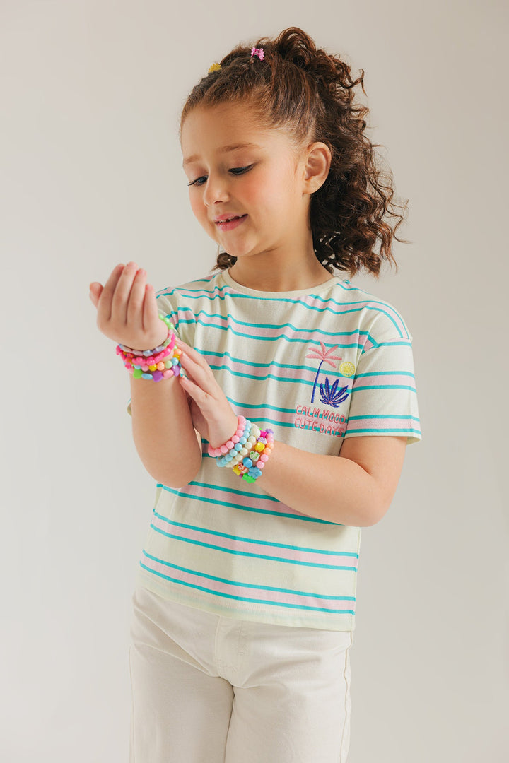 A splash of seaside charm, this striped top brings a playful touch to everyday style. The soft, light green fabric is adorned with cheerful horizontal stripes in vibrant blue. A delightful embroidery on the chest adds a fun, summery vibe to the chest. With its comfortable fit and breezy design, this top is perfect for sunny adventures and carefree days.