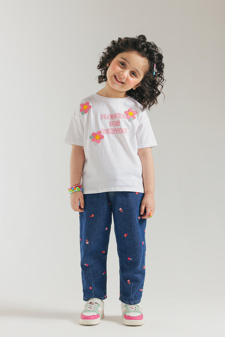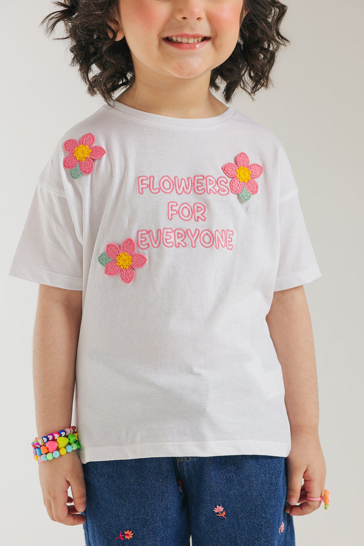 Spread smiles and positivity with this charming white graphic tee, a perfect blend of comfort and delightful messaging for your little one! This short-sleeved top features the cheerful phrase "FLOWERS FOR EVERYONE" in bold pink lettering, beautifully accented by vibrant embroidered floral motifs in shades of pink and yellow. Crafted for a relaxed fit, it ensures breathable ease for all their daily adventures. This tee is ideal for casual outings, playdates, or adding a distinctive and joyful flair to your child's everyday style.