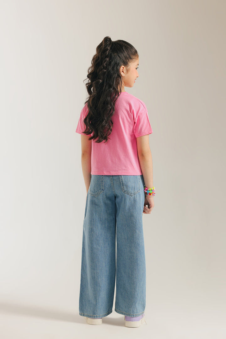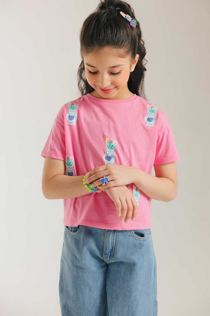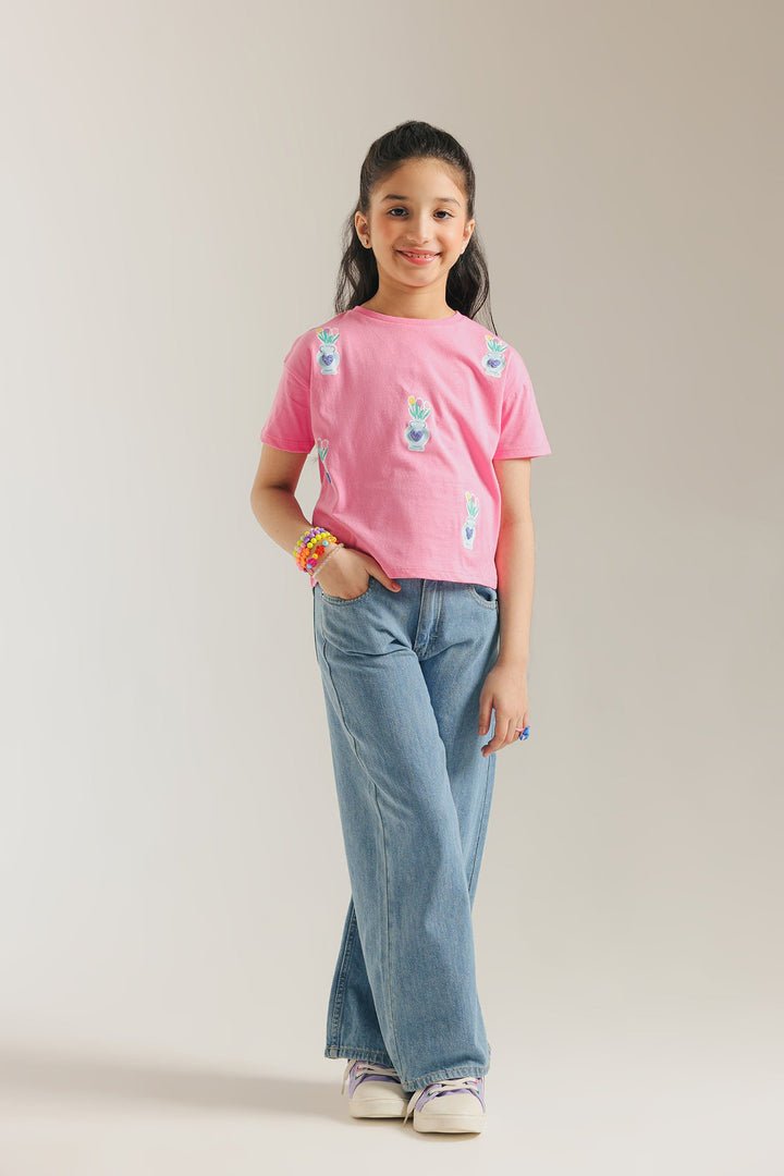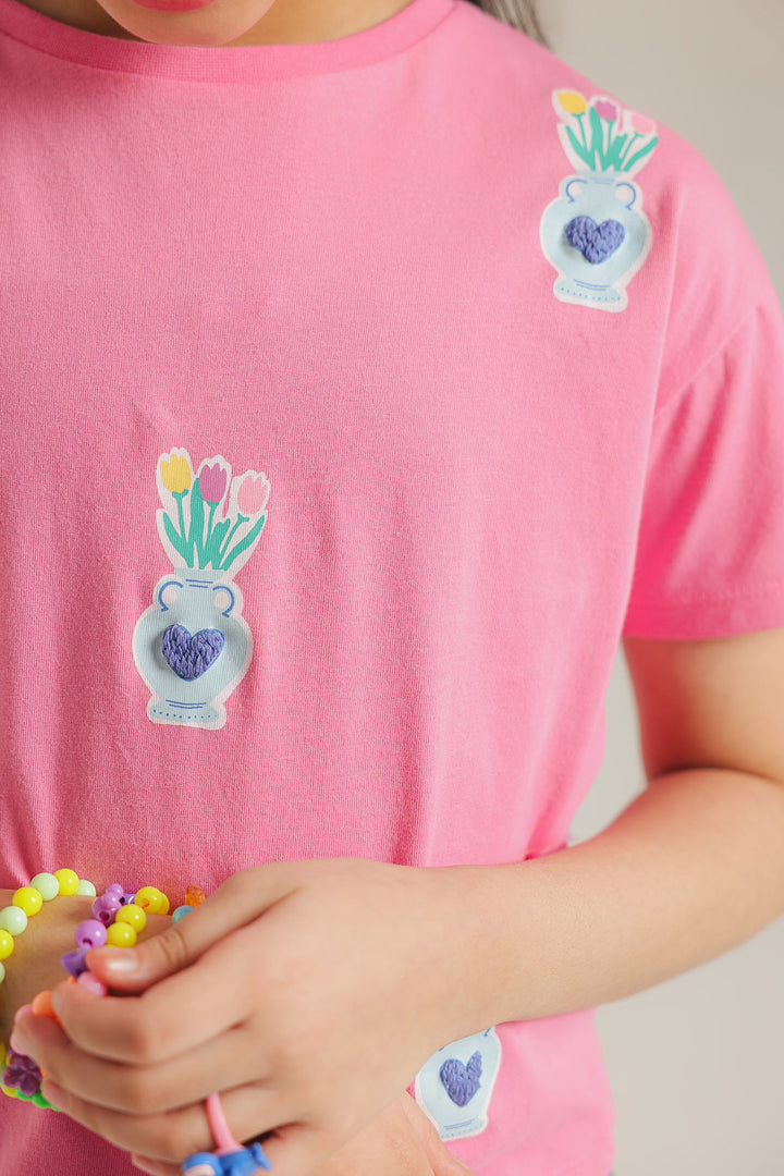 his charming T-shirt is a fresh and stylish pick for any casual day. Made from soft pink fabric, it's adorned with a repeating pattern of small embroidered potted plants in shades of blue and green. The simple, elegant design and comfortable fit make this top a modern and versatile choice.