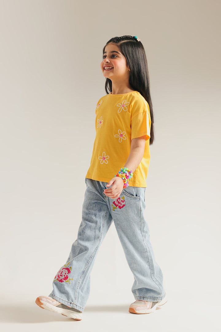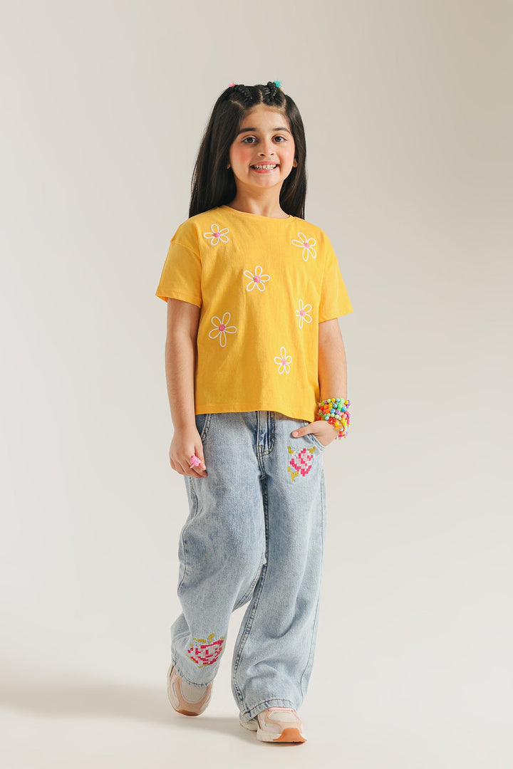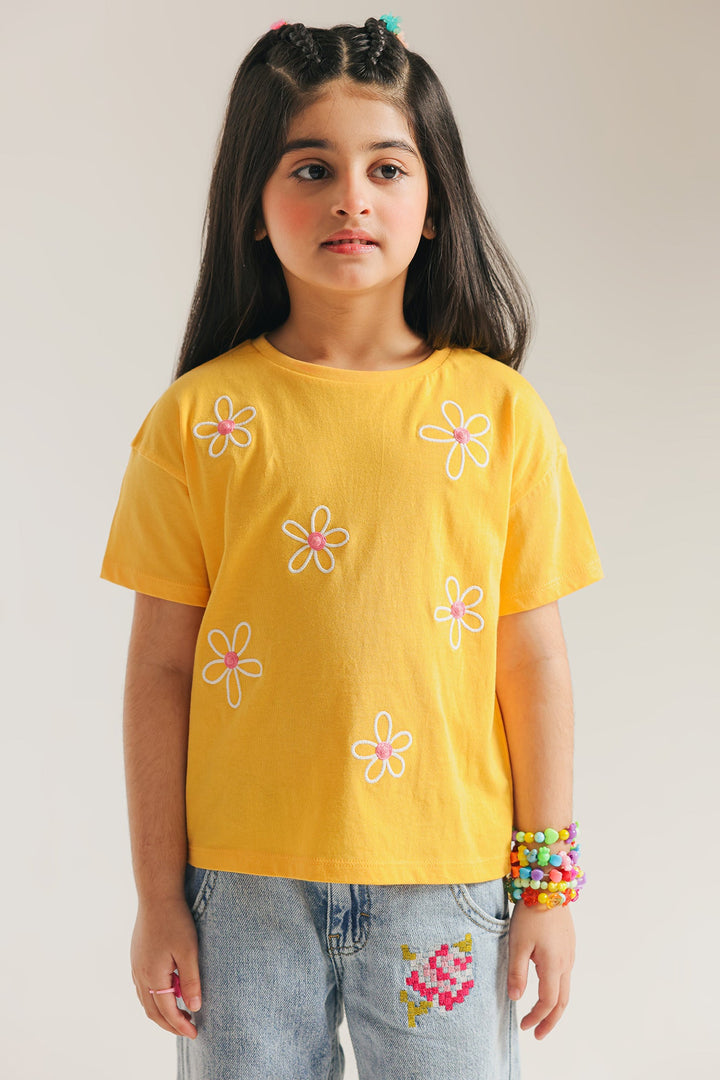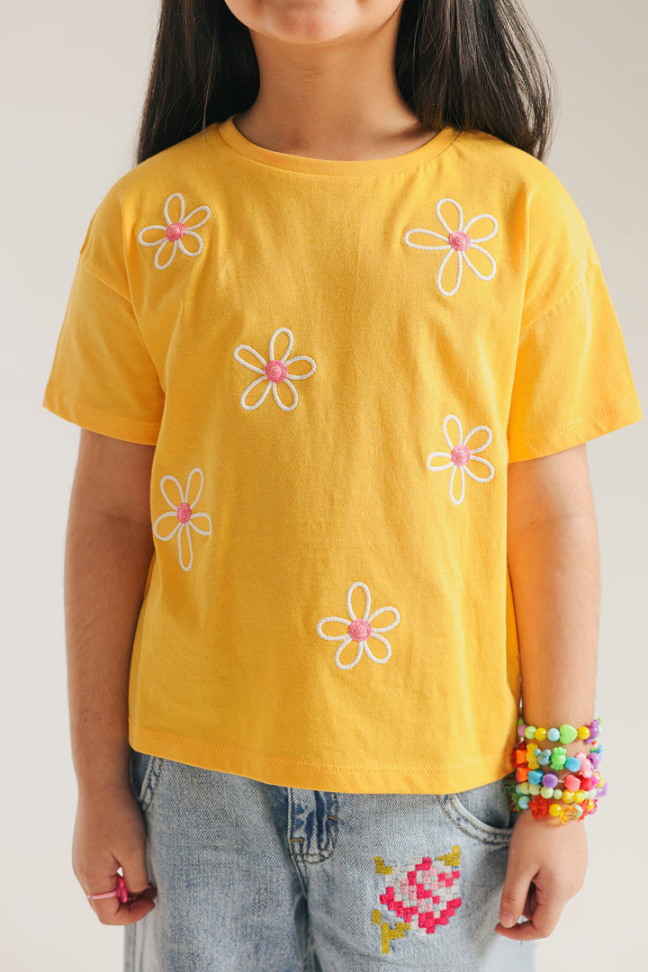 Step into a world of pure sunshine with this delightful floral tee. The cheerful yellow fabric is a perfect canvas for the scattering of delicate white daisies, each with a sweet pink center, creating a look that is both playful and fresh. Designed for comfort and style, this top is an instant mood-booster, perfect for brightening up any day.
