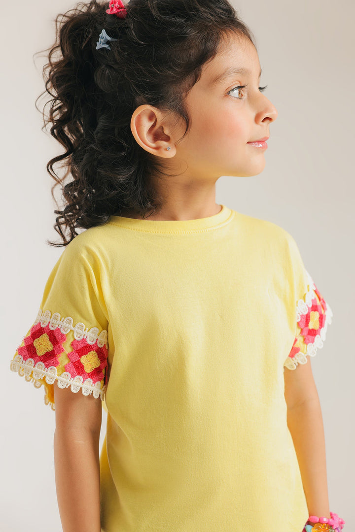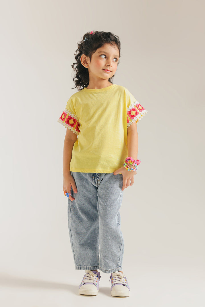 This cheerful yellow top is a delightful and unique staple for a casual wardrobe. The comfortable, loose-fitting silhouette is perfectly complemented by the eye-catching sleeves, which are adorned with a vibrant, intricate pattern of red, white, and yellow motifs, adding a touch of playful artistry and a charming flair to this simple top.