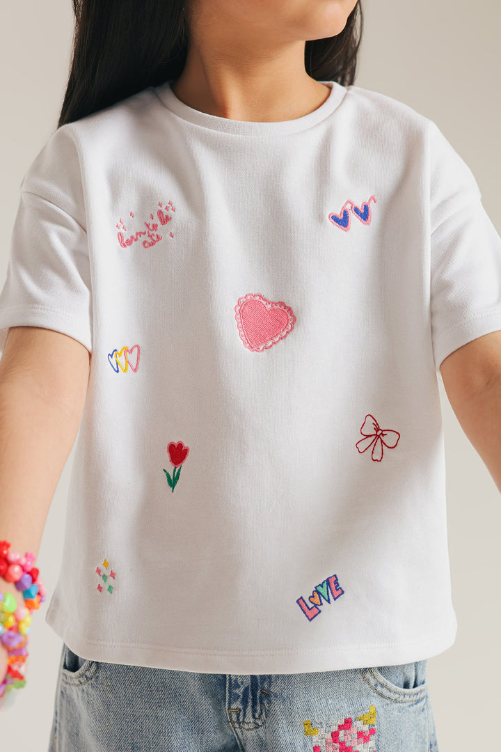 Whimsical dreams take flight in this charming white top. Delicate, colorful embroidered details featuring hearts, butterflies, and flowers are scattered across the soft fabric, creating a sweet and playful design. This comfortable tee is perfect for little ones who love to add a touch of magic to their everyday style.