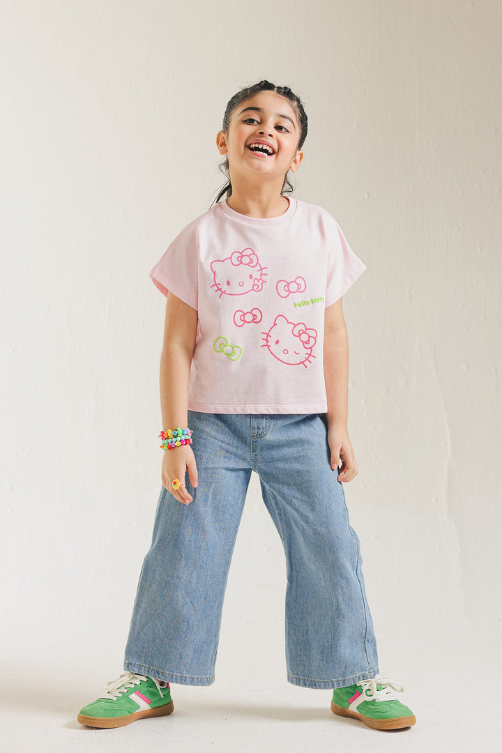 Bring a touch of iconic cuteness to her everyday style with this adorable light pink T-shirt! Featuring Hello Kitty graphics and delicate bow details. Crafted from soft, breathable fabric in a relaxed fit, it's perfect for casual outings or simply adding a playful flair to her look.
