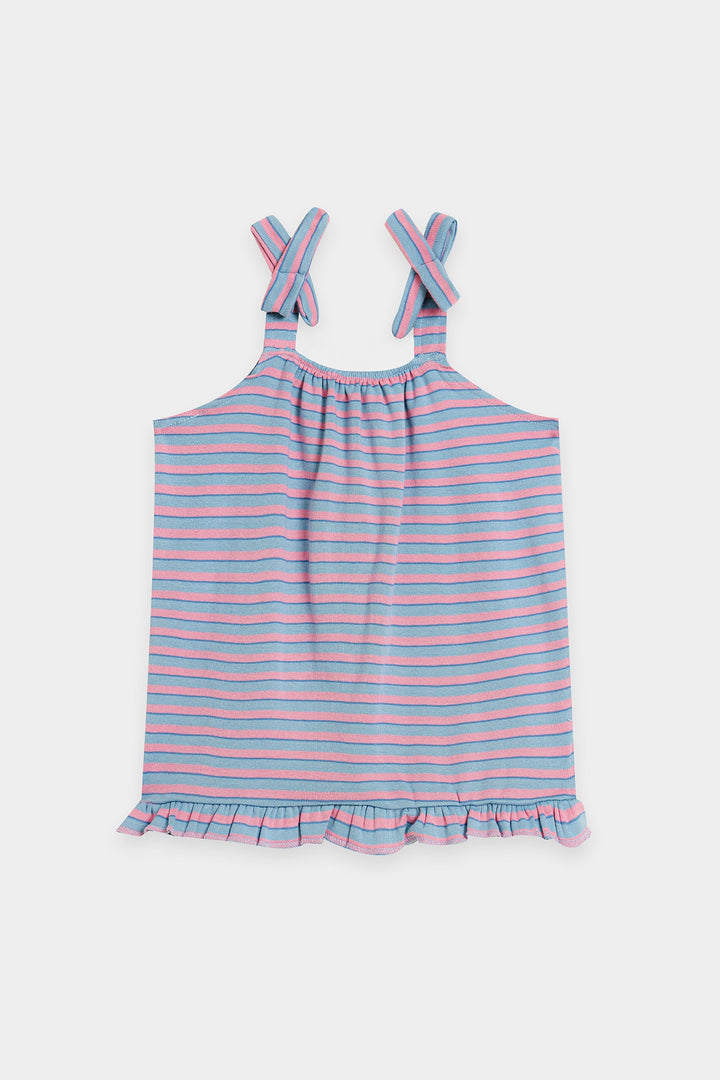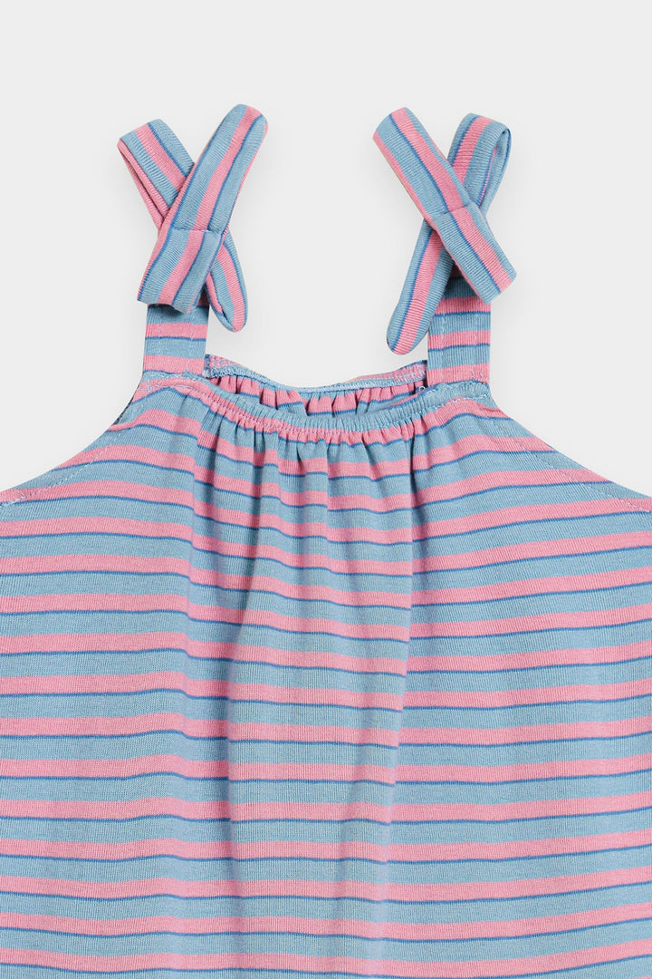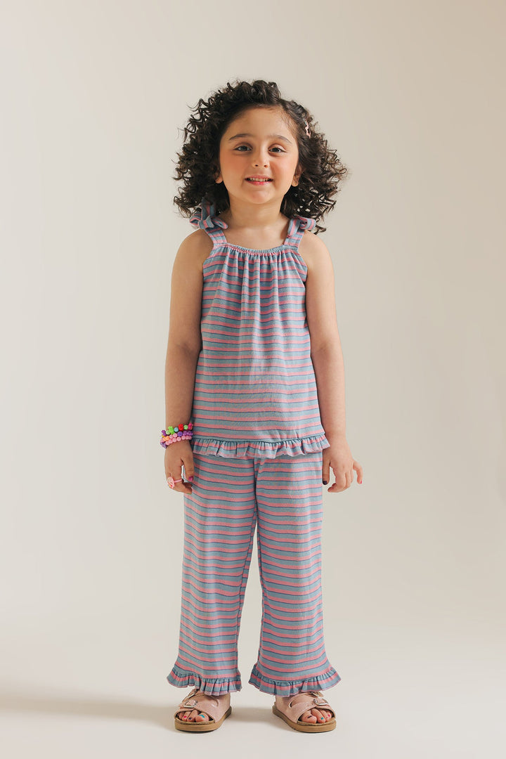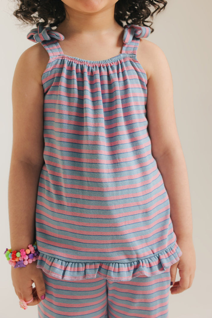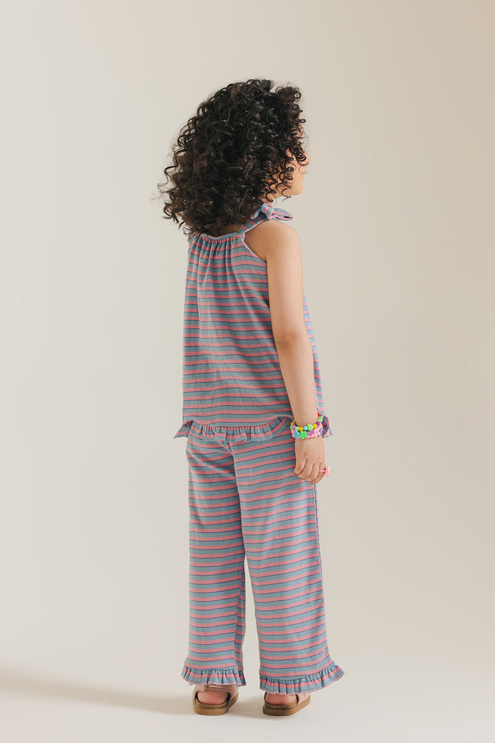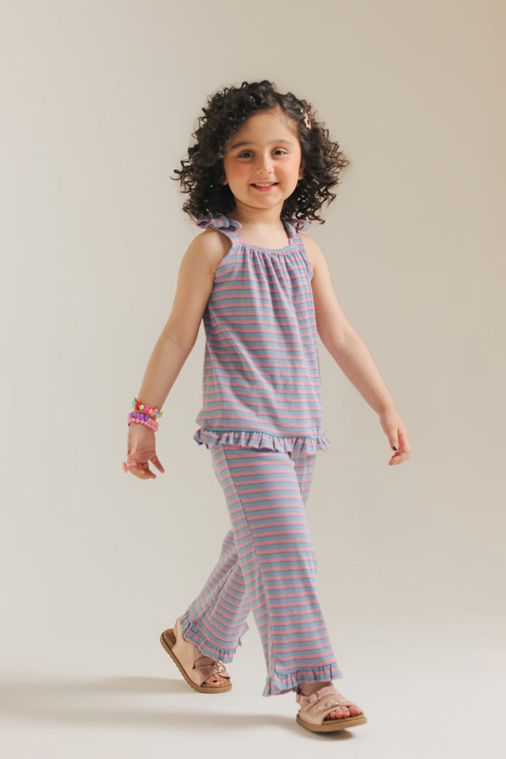 Let your little one step out in style with this charming striped coord set! This playful ensemble features a delightful combination of soft pink and sky blue horizontal stripes. The top is a sleeveless tank with sweet tie-up shoulder straps and a delicate ruffle hem, adding a touch of whimsy. The matching trousers boast a comfortable elasticated waist and a charming ruffled detail at the hem, completing the cohesive and comfortable look. Perfect for warm days and active play, this set is sure to become a favorite in any child's wardrobe.