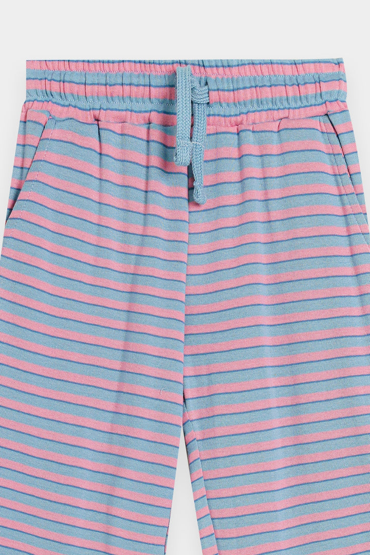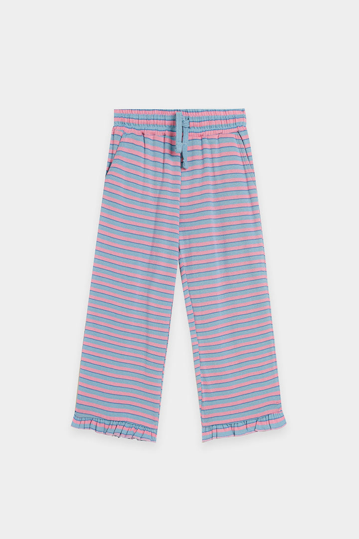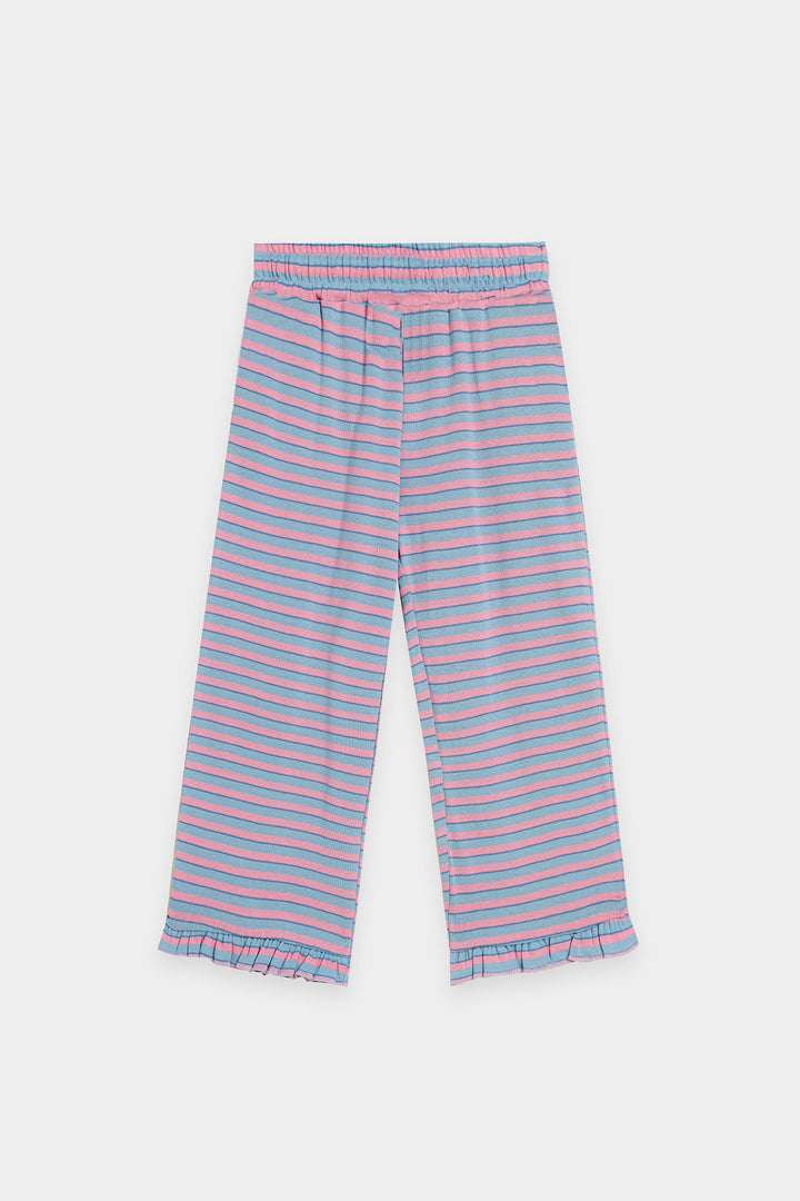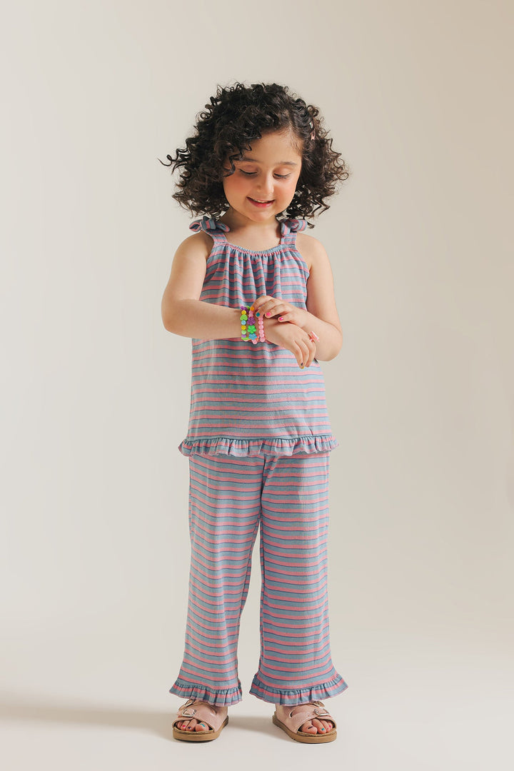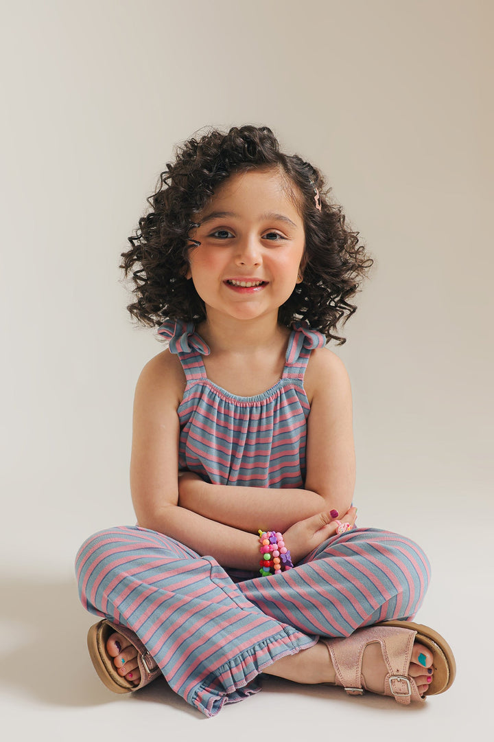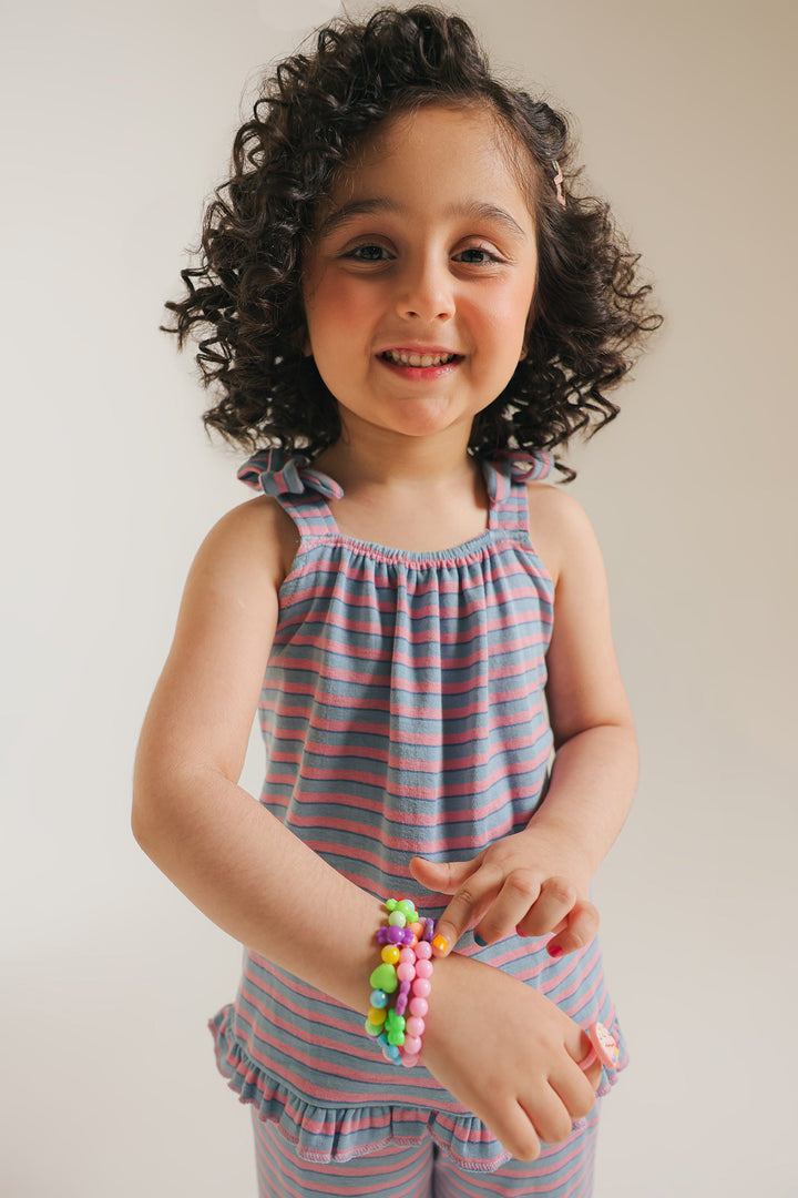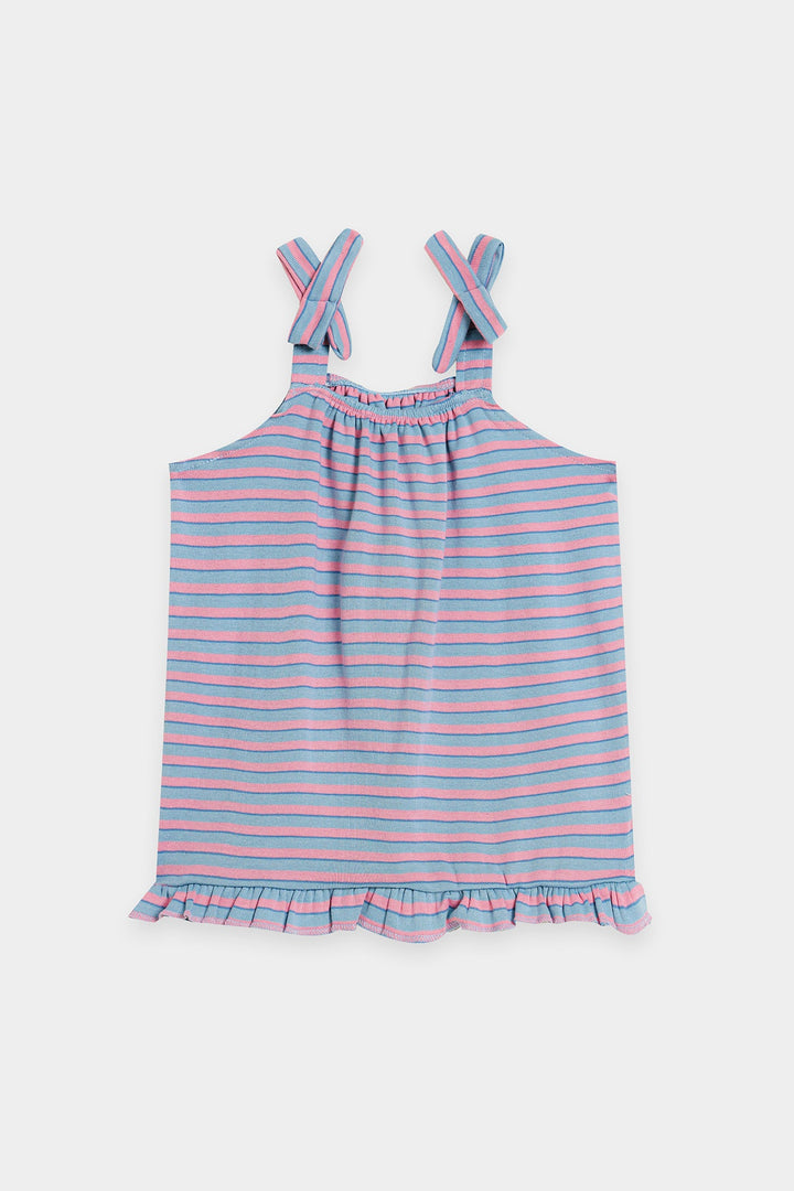 Let your little one step out in style with this charming striped coord set! This playful ensemble features a delightful combination of soft pink and sky blue horizontal stripes. The top is a sleeveless tank with sweet tie-up shoulder straps and a delicate ruffle hem, adding a touch of whimsy. The matching trousers boast a comfortable elasticated waist and a charming ruffled detail at the hem, completing the cohesive and comfortable look. Perfect for warm days and active play, this set is sure to become a favorite in any child's wardrobe.