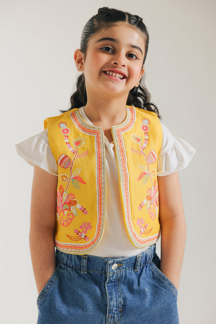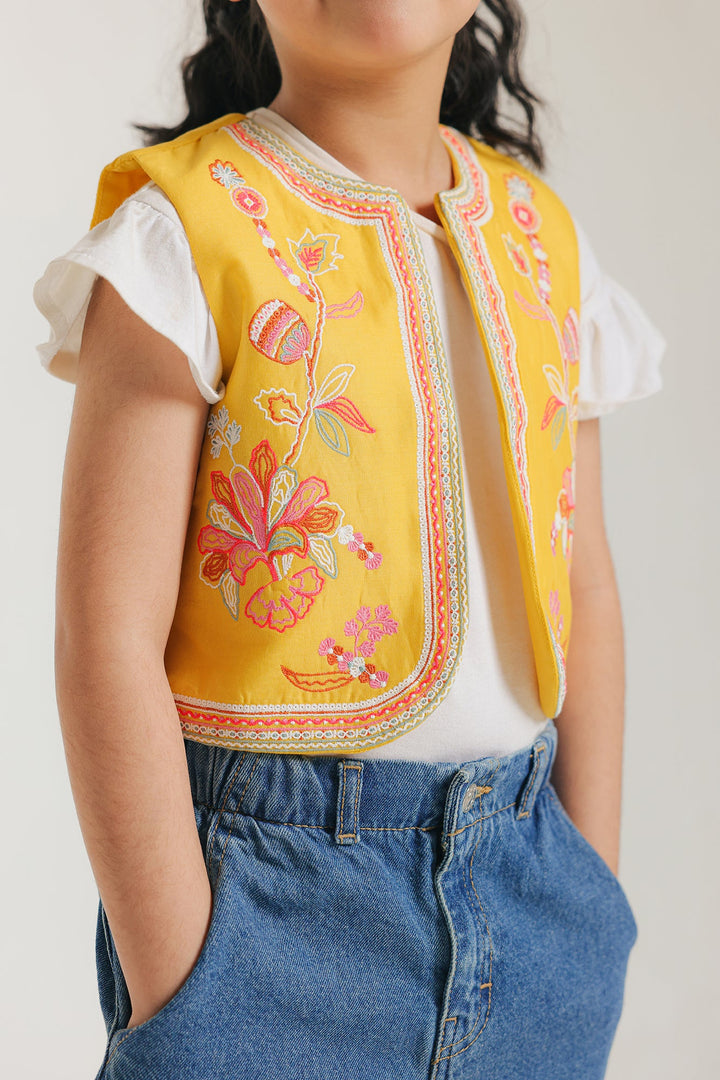This stunning waistcoat features a captivating design and is crafted in a chic sleeveless front open silhouette. The intricate embroidery in vibrant hues adds a touch of traditional richness. Perfect for fun gatherings, this elegant waistcoat in a vibrant yellow shade is sure to make a statement.