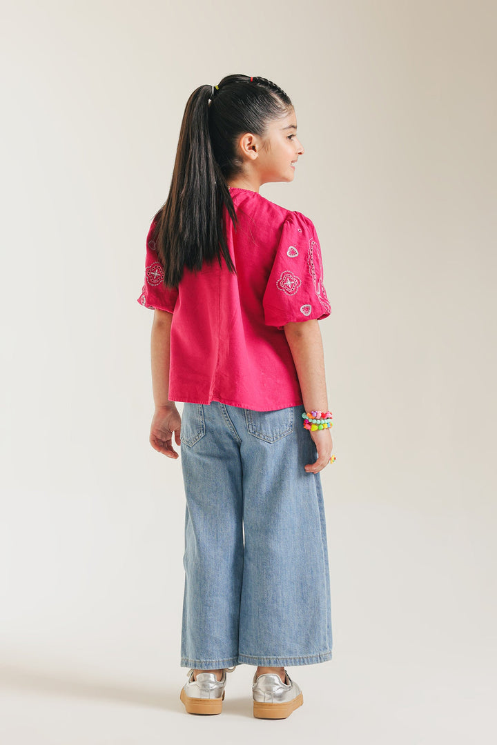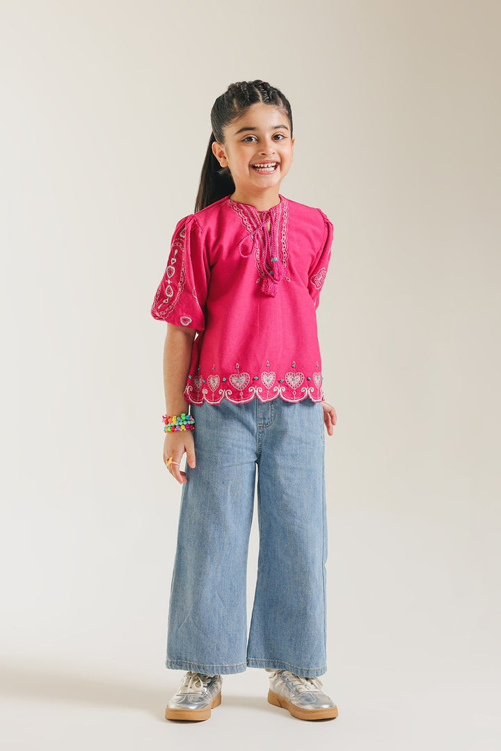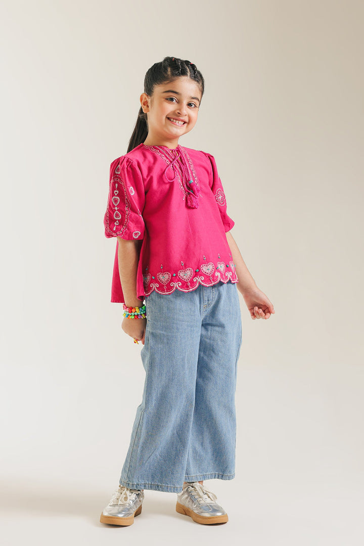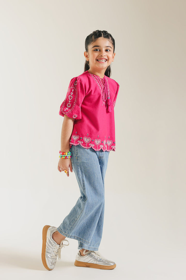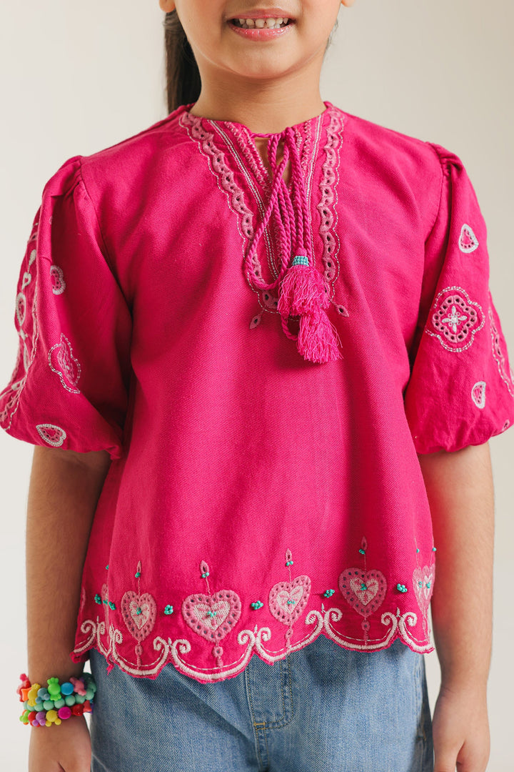 Brighten her day with this vibrant fuchsia top, a burst of cheerful style and delightful details! Featuring intricate embroidery that dances across the sleeves and hem, along with playful tassel ties at the neckline, this top is designed to charm. Its comfortable, relaxed fit ensures she stays cool and happy for any fun outing.