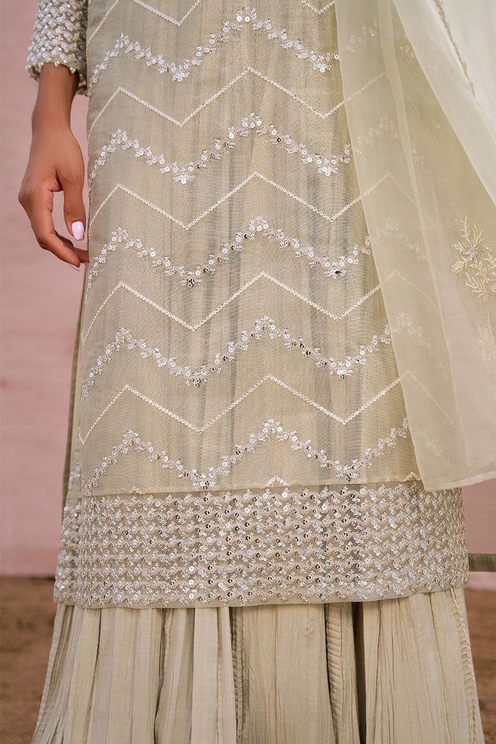 - Experience unparalleled elegance with our TWILIGHT CASCADE-3PC ZARI EMBROIDERED PRET. The straight shirt boasts a side open detail with delicate tassels and zari work, complemented by intricate embroidery on the front, neckline, and sleeves. The trousers feature a rushed paneled design and the silk fabric adds a touch of luxury with its crushed effect. Complete your look with the organza embroidered dupatta.