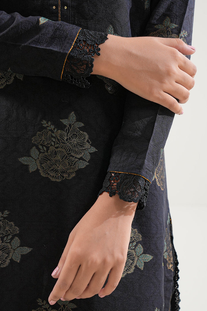Discover Refined Texture And Timeless Style With SAYA’s Unstitched Jacquard Cotton 3-Piece Suit In Black. Expertly Woven On A Jacquard Loom, The Premium Cotton Shirt Displays An Intricate Self-Jacquard Pattern That Adds Depth Without Overpowering. Accompanied By A Dyed Cambric Trouser And A Coordinated Jacquard Dupatta, This Ensemble Offers Tailoring Flexibility And Sophisticated Versatility. The Rich Black Hue Enhances Its Formal Appeal, Making It Perfect For Festivals, Semi-Formal Gatherings, Or Elevated Daywear. From Its High-Quality Fabric To Its Thoughtful Design, This Set Embodies Comfort, Craftsmanship, And Contemporary Grace.