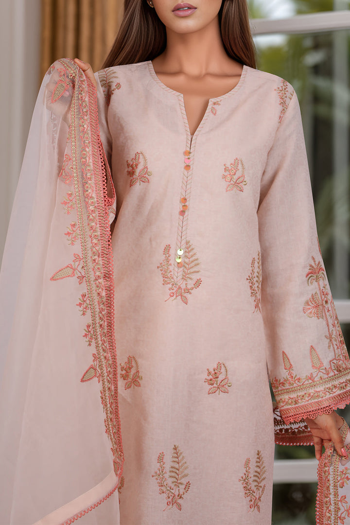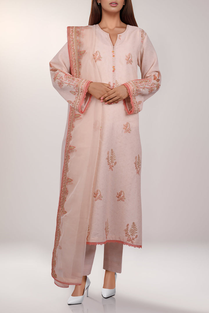 Add sophistication to your wardrobe with Saya.pk's unstitched embroidered self-jacquard 3-piece suit. This premium set features an intricately embroidered self-jacquard shirt, plain trousers, and a coordinating embroidered dupatta, perfect for semi-formal and festive occasions. Elevate your style effortlessly.
