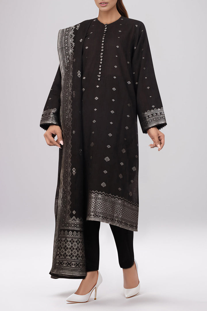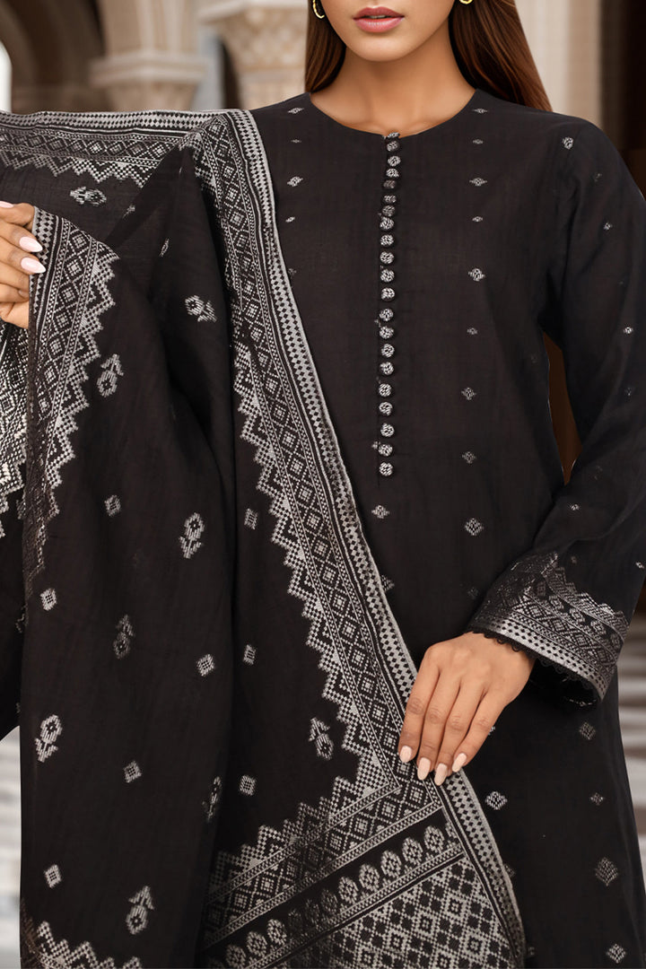 3-Piece Ensemble Crafted From Cotton Jacquard That Harmonizes Rich Texture With Breathable Comfort. The Unstitched Shirt Showcases Intricate Self-Jacquard Weave, Offering Subtle Depth And Tailoring Freedom For A Personalized Fit. Accompanied By A Coordinated Jacquard Dupatta For Seamless Design Continuity, And A Dyed Cambric Trouser That Introduces Structure And Ease. This SAYA Set Blends Sophisticated Fabrication With Elevated Utility—Ideal For Elegant Festivities, Refined Daywear, Or Bespoke Styling With Minimal Effort.