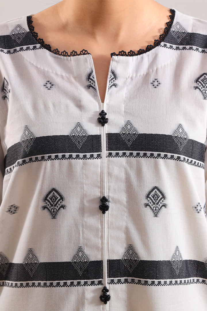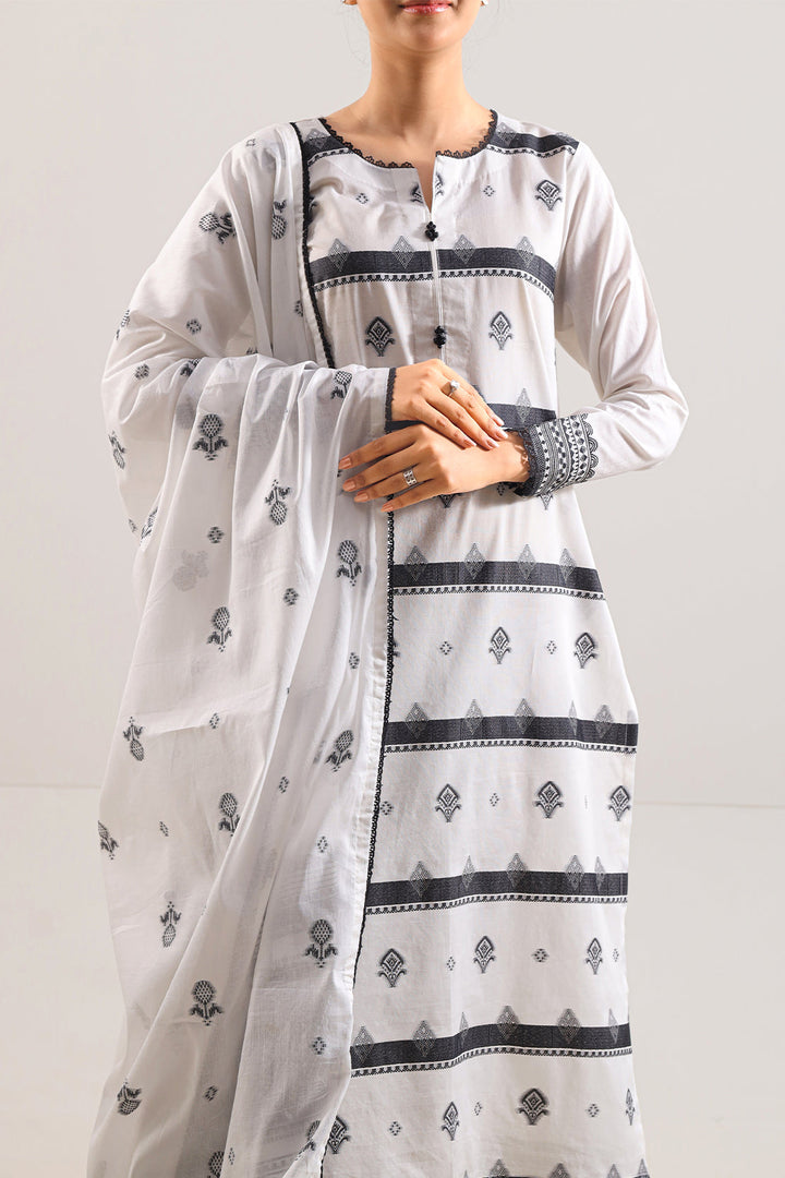 3-Piece Ensemble Crafted From Cotton Jacquard That Harmonizes Rich Texture With Breathable Comfort. The Unstitched Shirt Showcases Intricate Self-Jacquard Weave, Offering Subtle Depth And Tailoring Freedom For A Personalized Fit. Accompanied By A Coordinated Jacquard Dupatta For Seamless Design Continuity, And A Dyed Cambric Trouser That Introduces Structure And Ease. This SAYA Set Blends Sophisticated Fabrication With Elevated Utility—Ideal For Elegant Festivities, Refined Daywear, Or Bespoke Styling With Minimal Effort.
