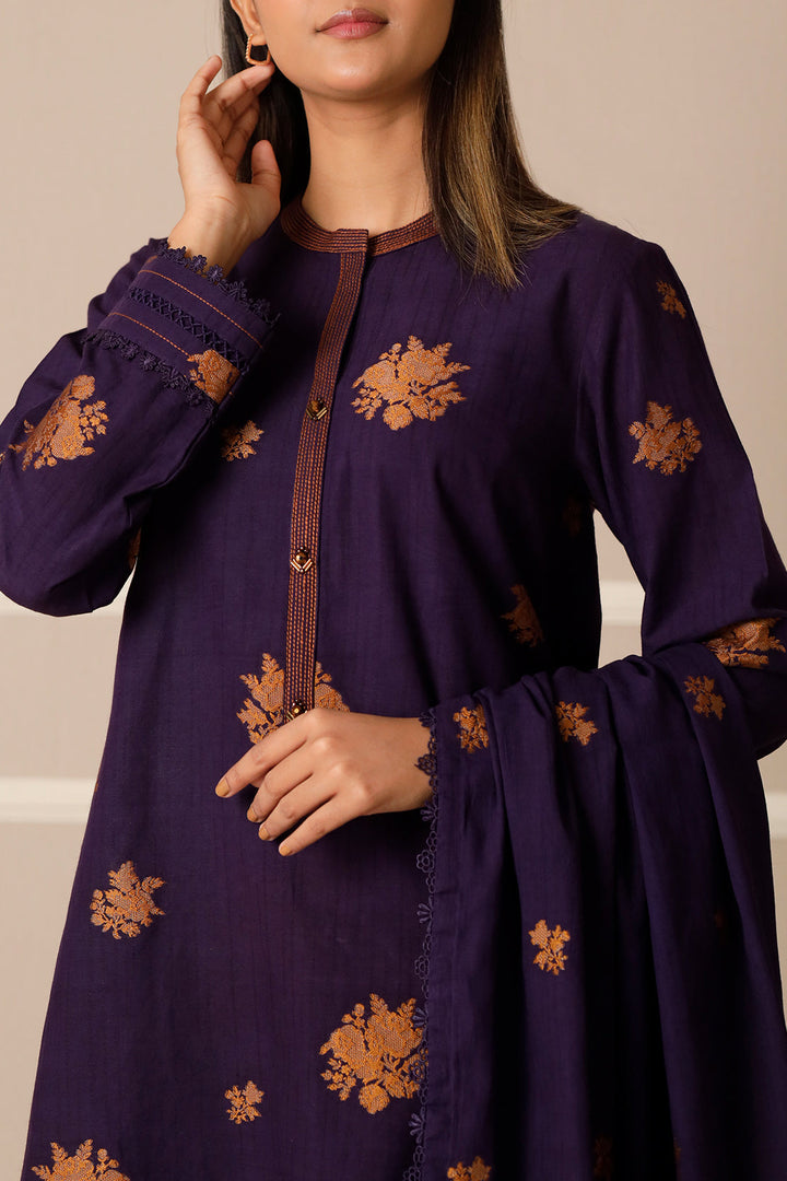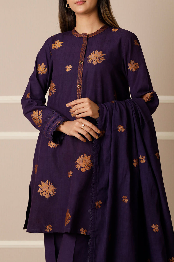 Embrace Tailoring Freedom With The SAYA Unstitched Jacquard Cotton 3-Piece Set, Woven From Rich Jacquard Cotton That Blends Texture, Breathability, And A Subtle Sheen. The Set Includes Yardage For Shirt, Trouser, And Dupatta — All In The Same Weave, Allowing A Seamless Cohesive Look. The Intricate Jacquard Pattern Acts As An Elegant Canvas, Ready For Embellishment Or Clean Minimal Styling. Perfect For Weddings, Festive Events, Or Elegant Day Soirees, This Ensemble Lets You Bring Your Signature Design Vision To Life Without Compromise.