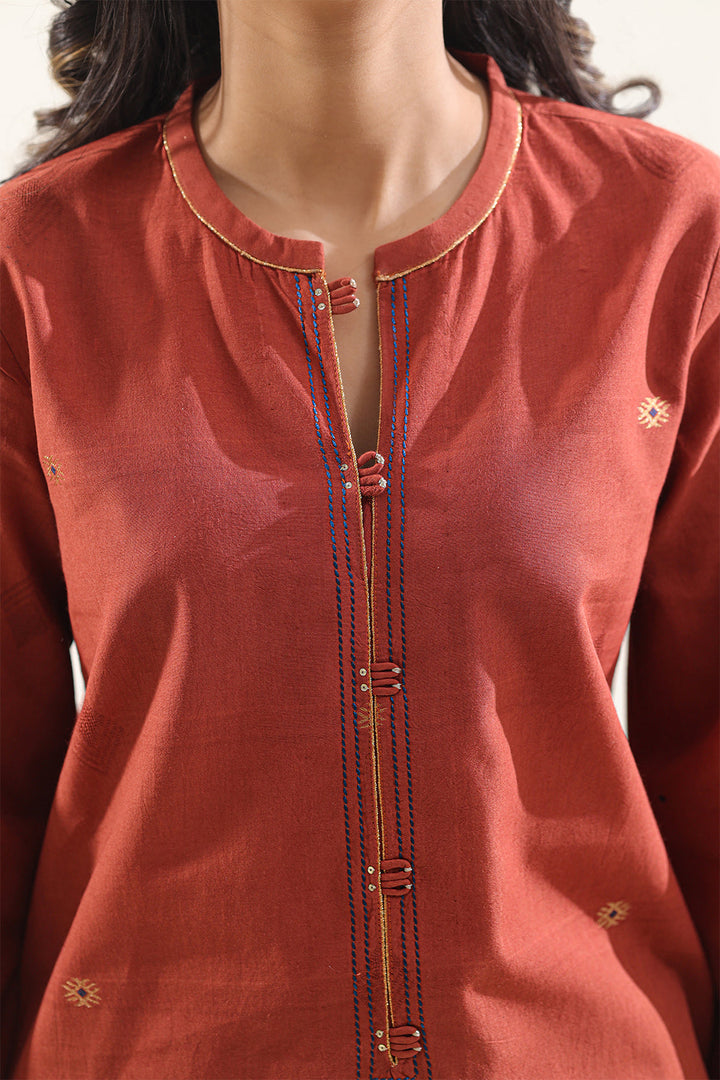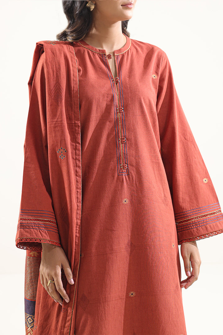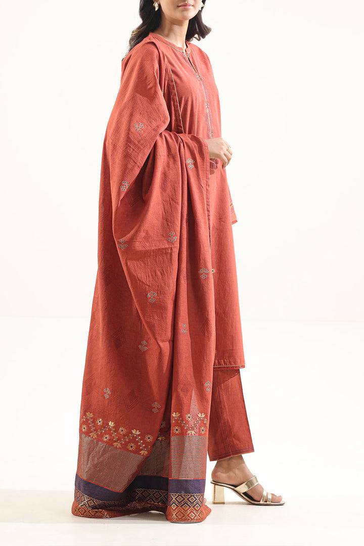 This unstitched three-piece set from SAYA arrives in a rich Rust tone, crafted from premium cotton-jacquard fabric that offers subtle texture and breathable comfort. The shirt panel comes with ample width for custom tailoring, the trouser piece provides smooth structure, and the matched dupatta completes the ensemble with flowing elegance. Tailor-friendly and versatile, this set is ideal for formal evenings, festive gatherings, or refined day-wear that values both design and ease.