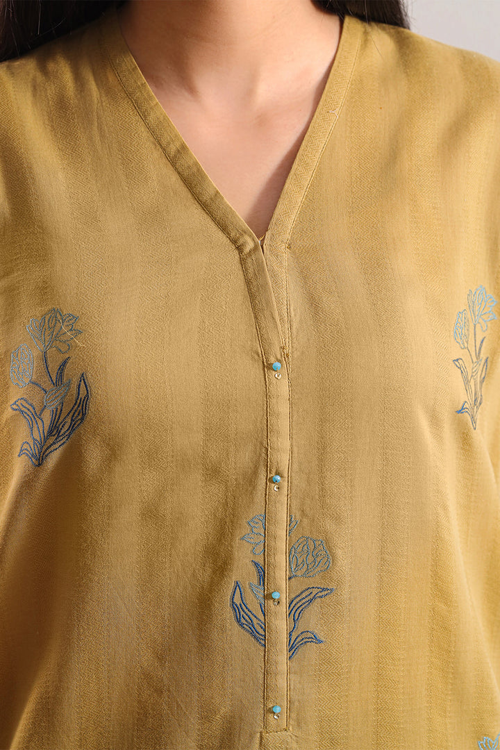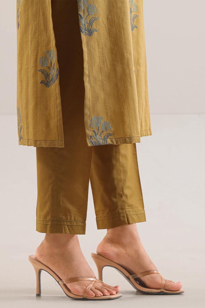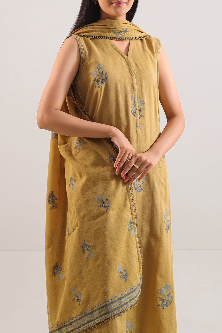 Elevate Your Semi-Formal Wardrobe With This Unstitched Jacquard Cotton 3-Piece By SAYA, Blending Textural Elegance, Refinement, And Tailoring Freedom. Crafted From Richly Textured Dyed Cotton Jacquard, The Premium Shirt Unfolds Intricate Weaves That Create Depth And Sophistication. Accompanied By A Coordinated Jacquard Dupatta That Mirrors The Shirt’s Textural Aesthetic, And A Dyed Cambric Trouser Offering Comfortable Structure And Styling Balance. Defined In A Subdued Dull Gold Tone, This Ensemble Embodies Timeless Style, Seasonal Versatility, And Effortless Stitching Customization For Semi-Formal Gatherings And Daytime Chic.