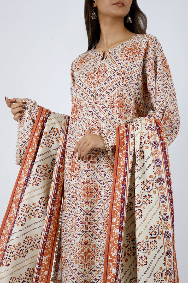 The Unstitched Jacquard Khaddar 3-Piece Set is a premium addition to your winter wardrobe. Made from high-quality jacquard khaddar fabric, it features a shirt, trouser, and dupatta. The exquisite jacquard patterns bring a touch of sophistication, allowing you to create a personalized look for casual or festive wear.