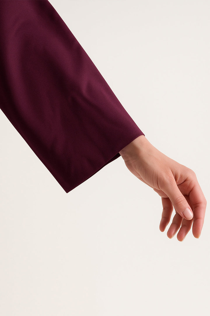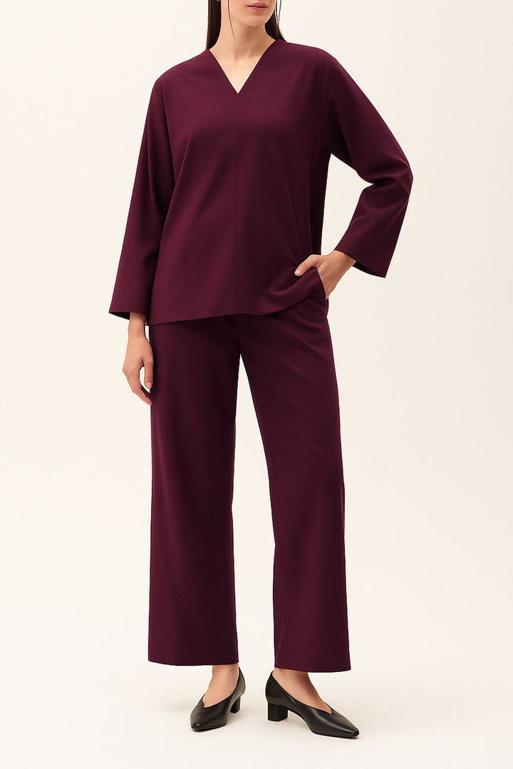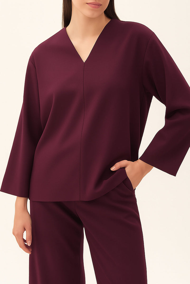 The V-Neck Wide Sleeve Crepe Top – Marsala By SAYA Merges Sculptural Elegance With Modern Comfort. Crafted From Fluid Crepe Fabric In A Rich Plum Rouge Shade, It Features A Gracious V-Neckline And Dramatic Wide Sleeves That Offer Subtle Structure. Tailored For Effortless Style, This Piece Is Ideal For Both Day-To-Night Wear, Lending Polished Sophistication With Relaxed Ease.