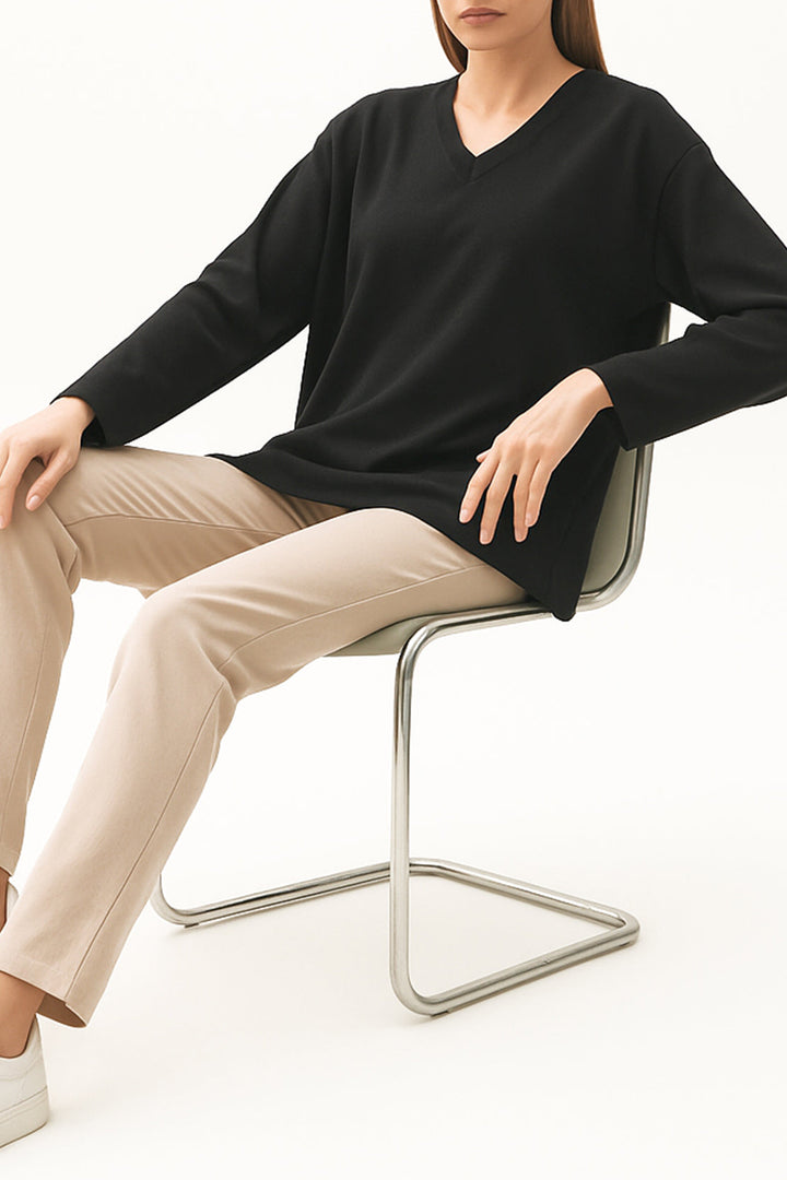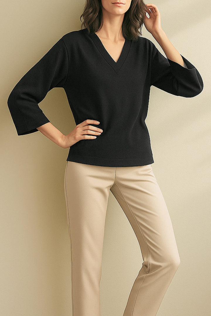 Exude Effortless Grace With SAYA’s V-Neck Wide Sleeve Crepe Top In Black, Beautifully Tailored From Premium Crepe Fabric That Offers A Smooth Drape And Luxurious Feel. The Lightweight, Flowing Material Ensures Breathability And All-Day Comfort, While The Elegant V-Neckline Accentuates The Neckline Gracefully. Wide Sleeves Add A Contemporary Flair, Lending A Balance Of Sophistication And Ease. The Deep Black Hue Enhances Its Timeless Appeal, Making It Perfect For Formal Gatherings, Evening Outings, Or Elevated Everyday Wear. Pair It With Trousers Or Skirts For A Polished, Fashion-Forward Look.