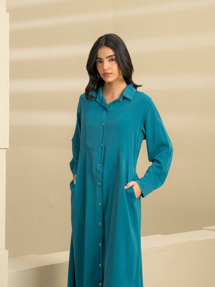 - Dyed button-down dress with metallic button closure on the