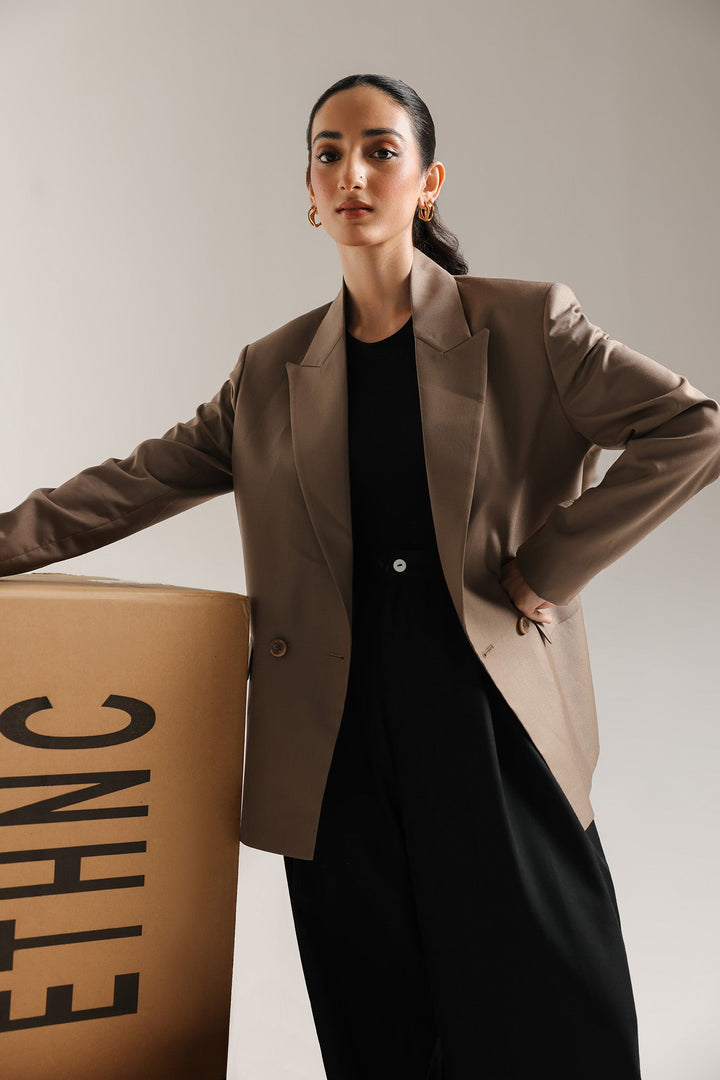 Command attention with this impeccably tailored blazer in a chic, versatile taupe/mocha brown. This contemporary blazer features a relaxed, generous fit with sharply defined shoulders and wide, classic peak lapels. It boasts a single-button closure and flap pockets, blending traditional suiting elements with a modern, fashion-forward silhouette. Perfect for layering over anything from a casual tee to a formal blouse, this blazer instantly elevates any ensemble with sophisticated authority.
